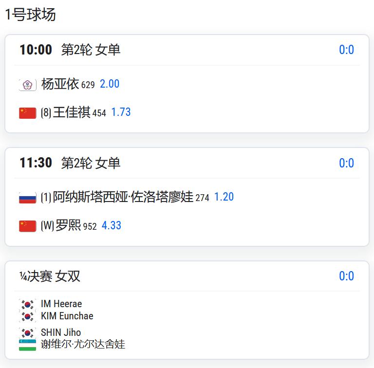 王佳祺将对阵中国台湾的杨亚依;