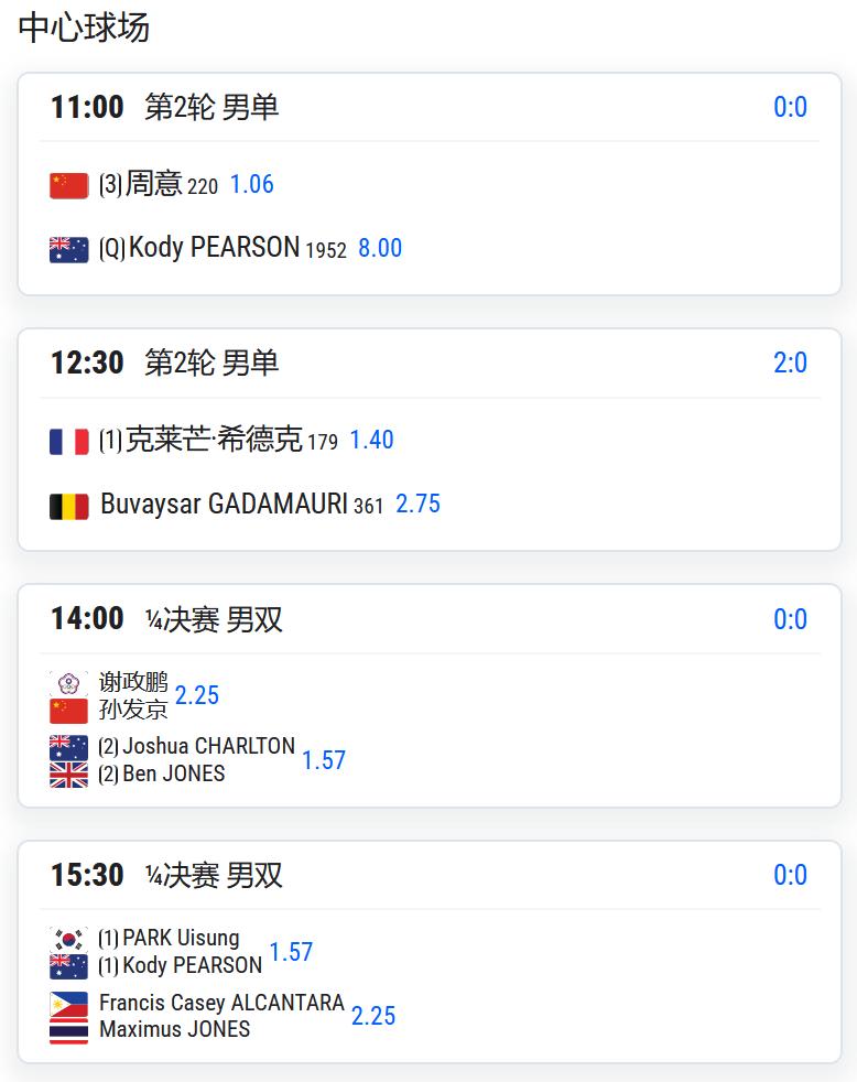 男双四分之一决赛,孙发京/谢正鹏将对阵2号种子查尔顿/琼斯;