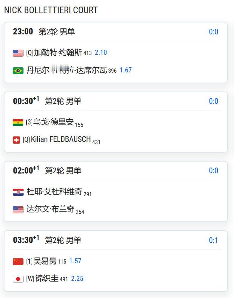CH75萨拉索塔,男单第二轮,头号种子吴易昺将对阵持外卡参赛的日本名将锦织圭;