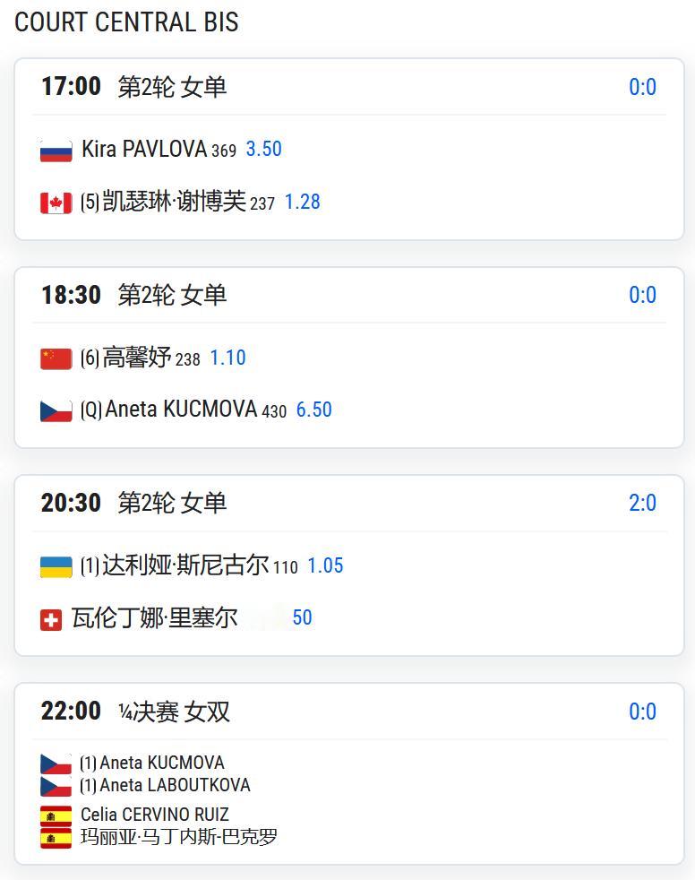 W75卡尔维,女单第二轮,高馨妤将对阵资格赛球员库科莫娃;