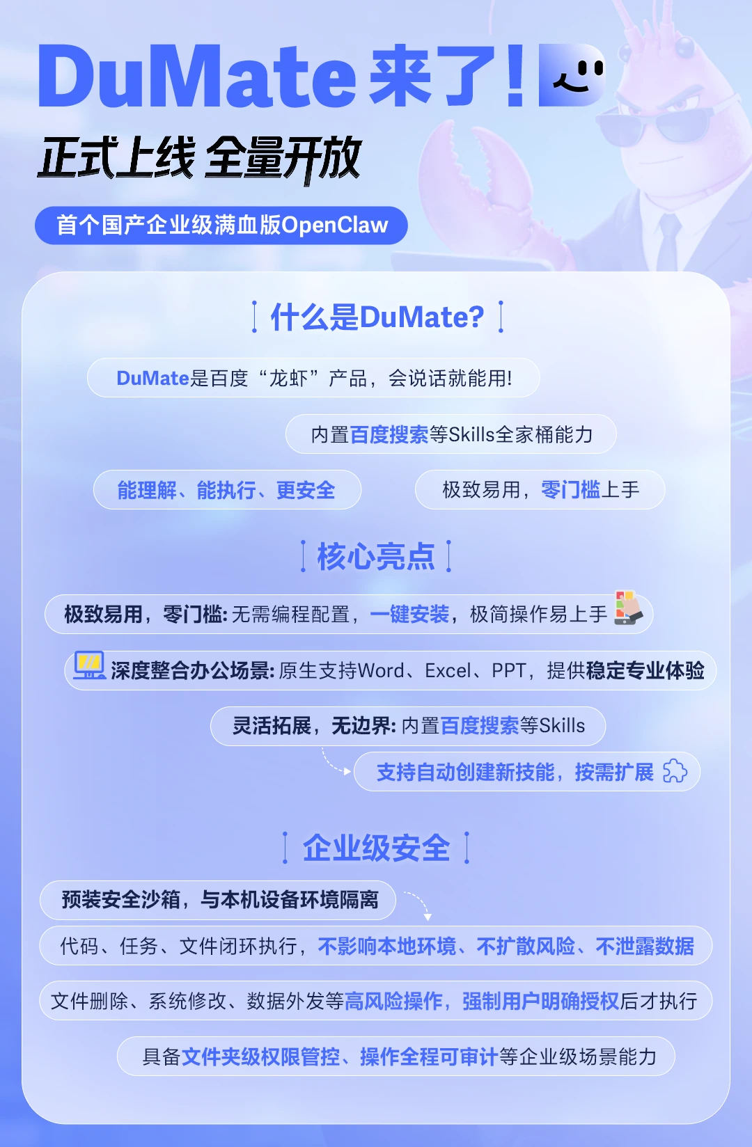 而且它还有企业级安全保障,预装安全沙箱,数据本地化处理,风险操作还要人工确认,DuMate还具备文件夹级权限管控、操作全程可审计等企业级场景能力。不管是个人用还是企业用,都挺靠谱。