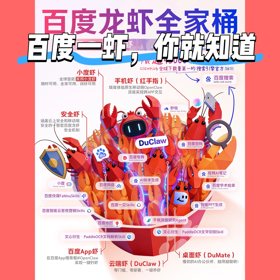 现在百度的龙虾全家桶也都齐活了,云端、手机、安全、桌面还有家用款都有,能覆盖不同场景的使用需求,要说还是大厂,这么快就龙虾配齐了!