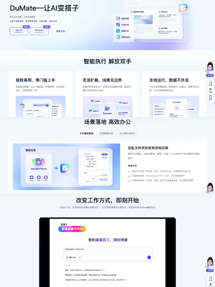 我想职场人应该都会懂,平时整理文件、做数据分析有多费时间费精力还有费脑子~,这个DuMate零代码、一键就能安装,原生支持Word、Excel、PPT,能自主完成跨应用、跨文件的任务,省了不少麻烦,效率拉满。