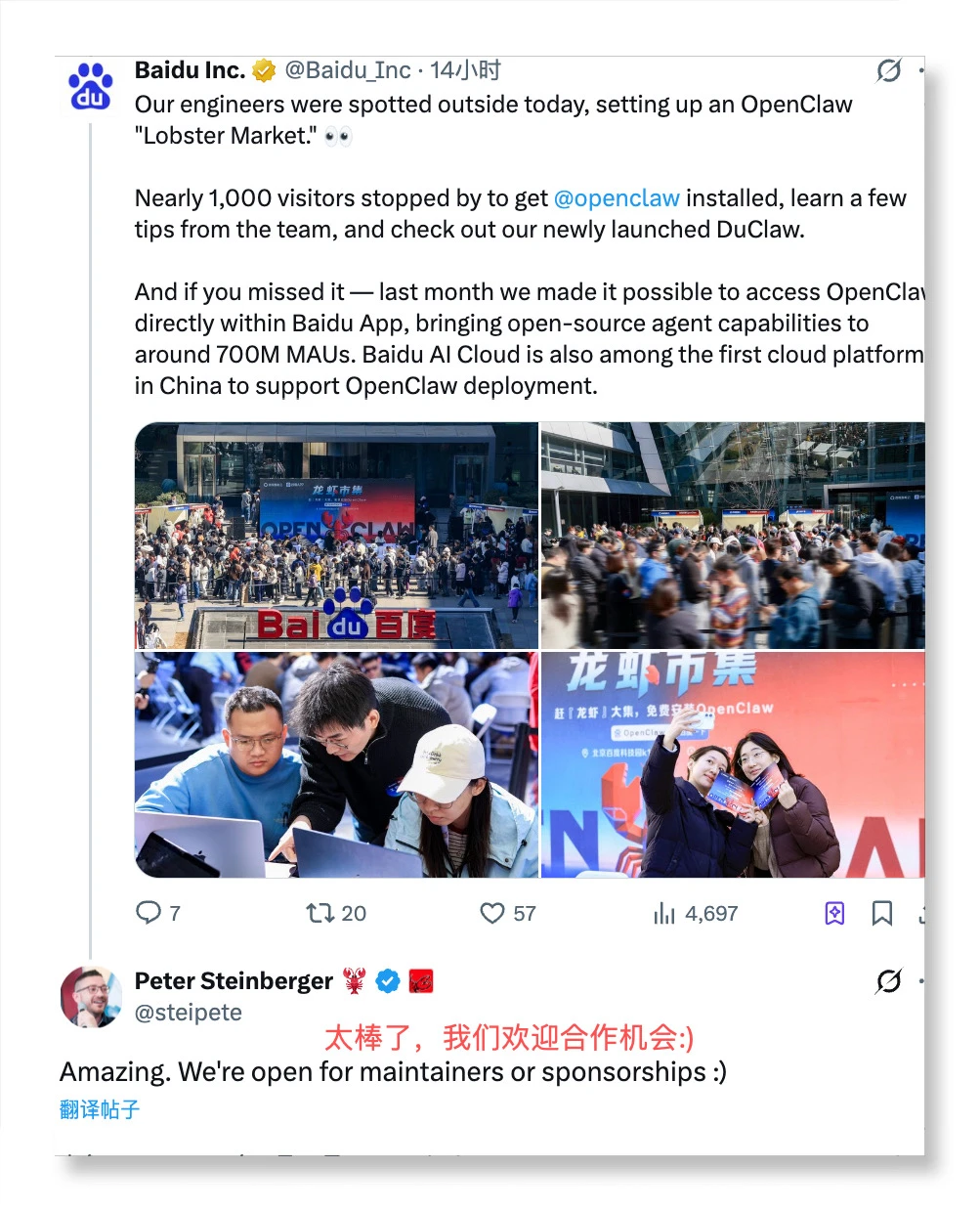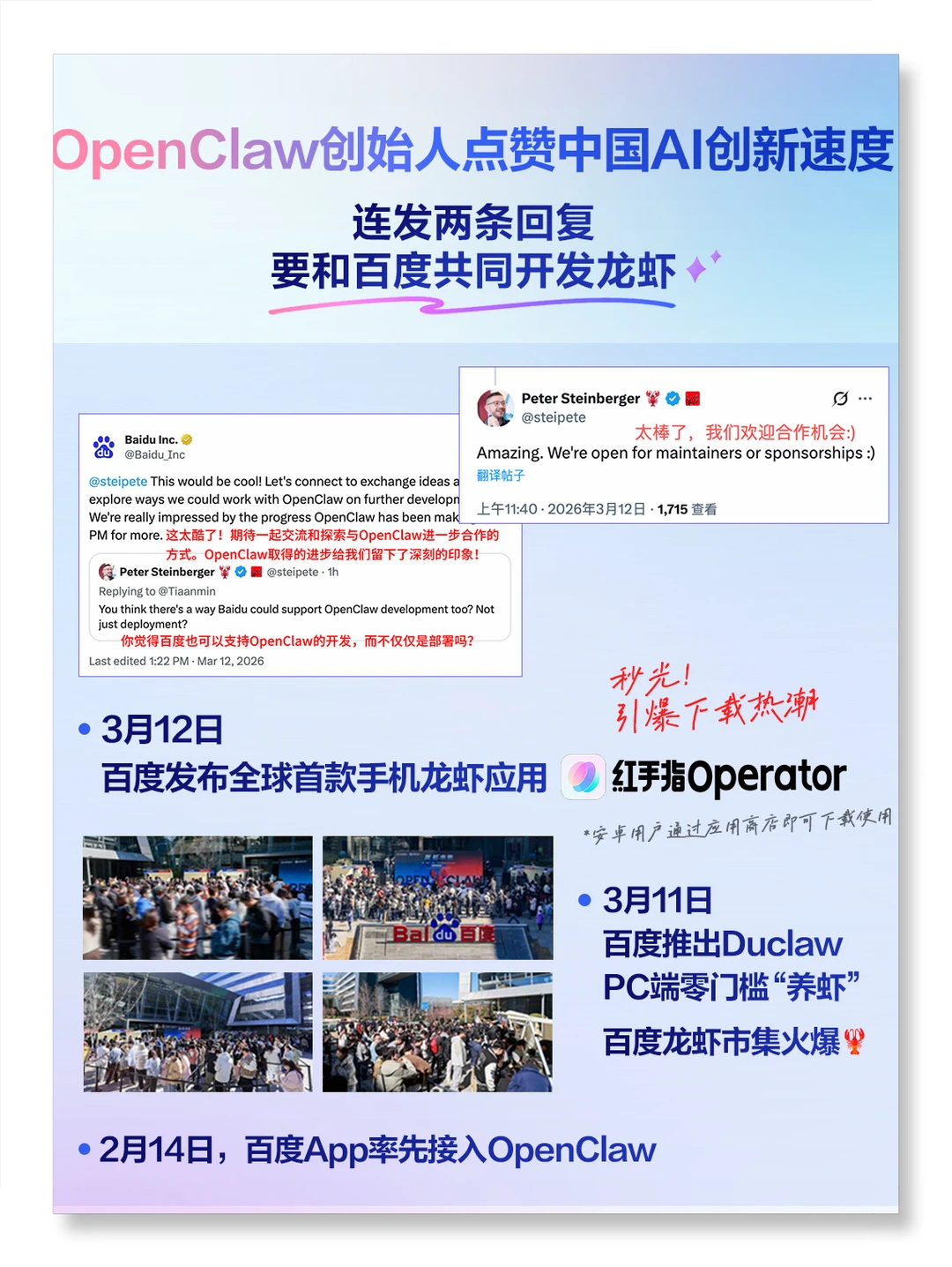 上线后直接引爆下载热潮,后台都出现资源紧缺的提示,百度智能云也在全速调配资源扩容。有意思的是,OpenClaw创始人Peter Steinberger,在海外社交平台连发两条回复,点赞中国AI创新速度,还表示希望能跟百度共同开发龙虾,这个认可度有点高!