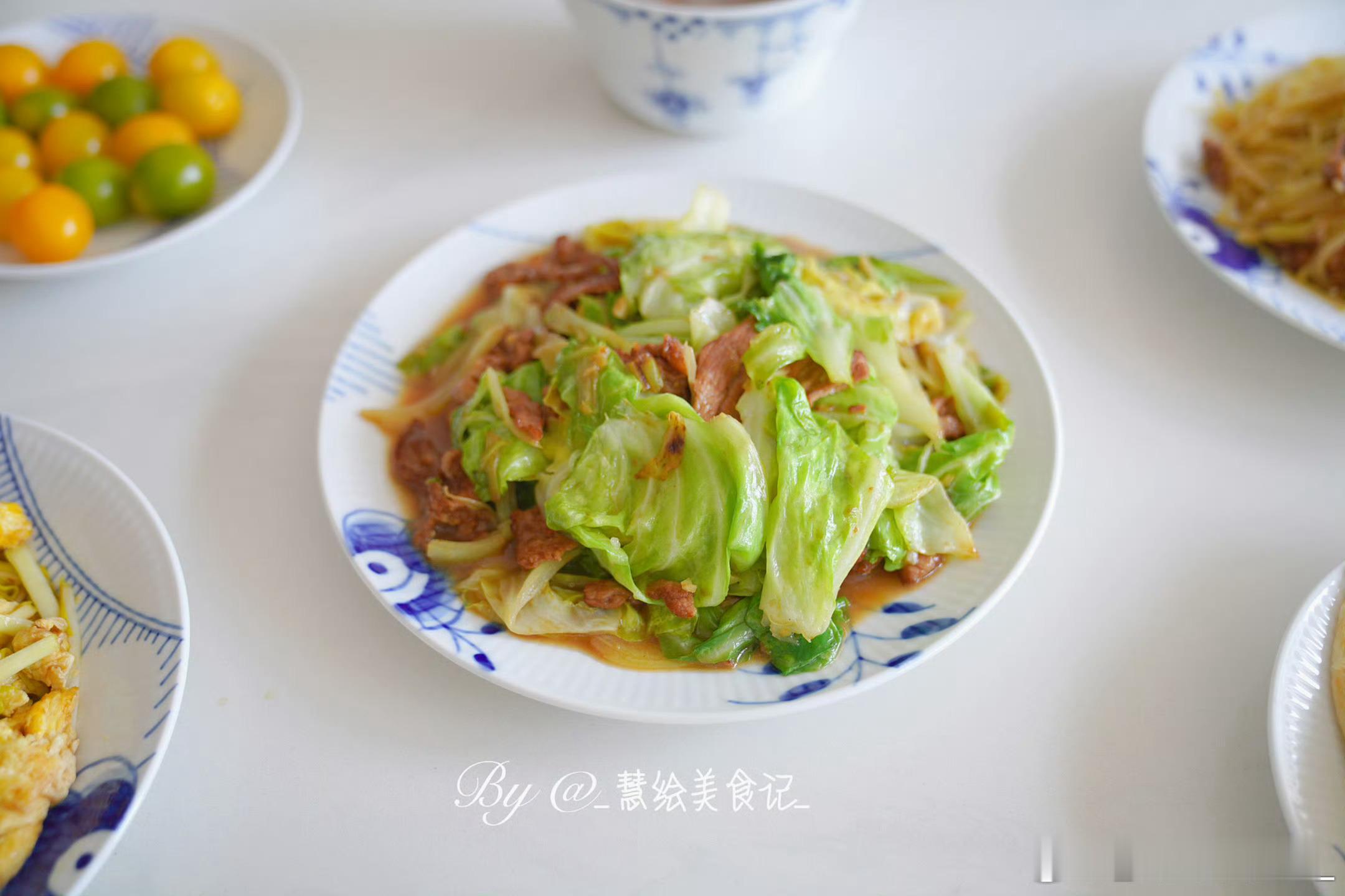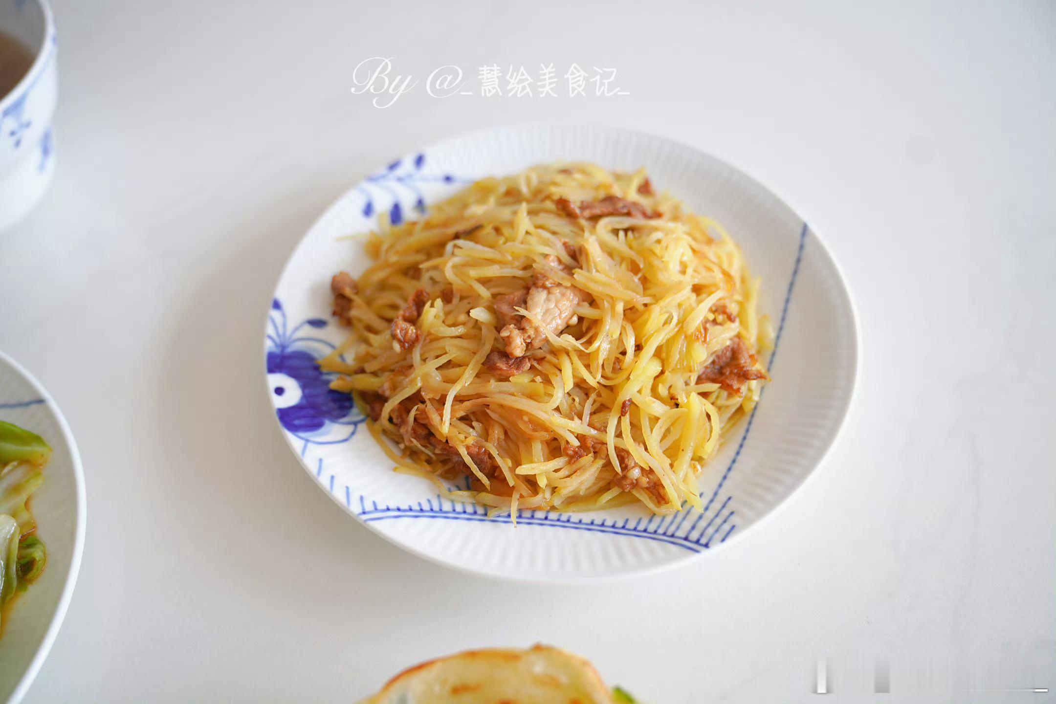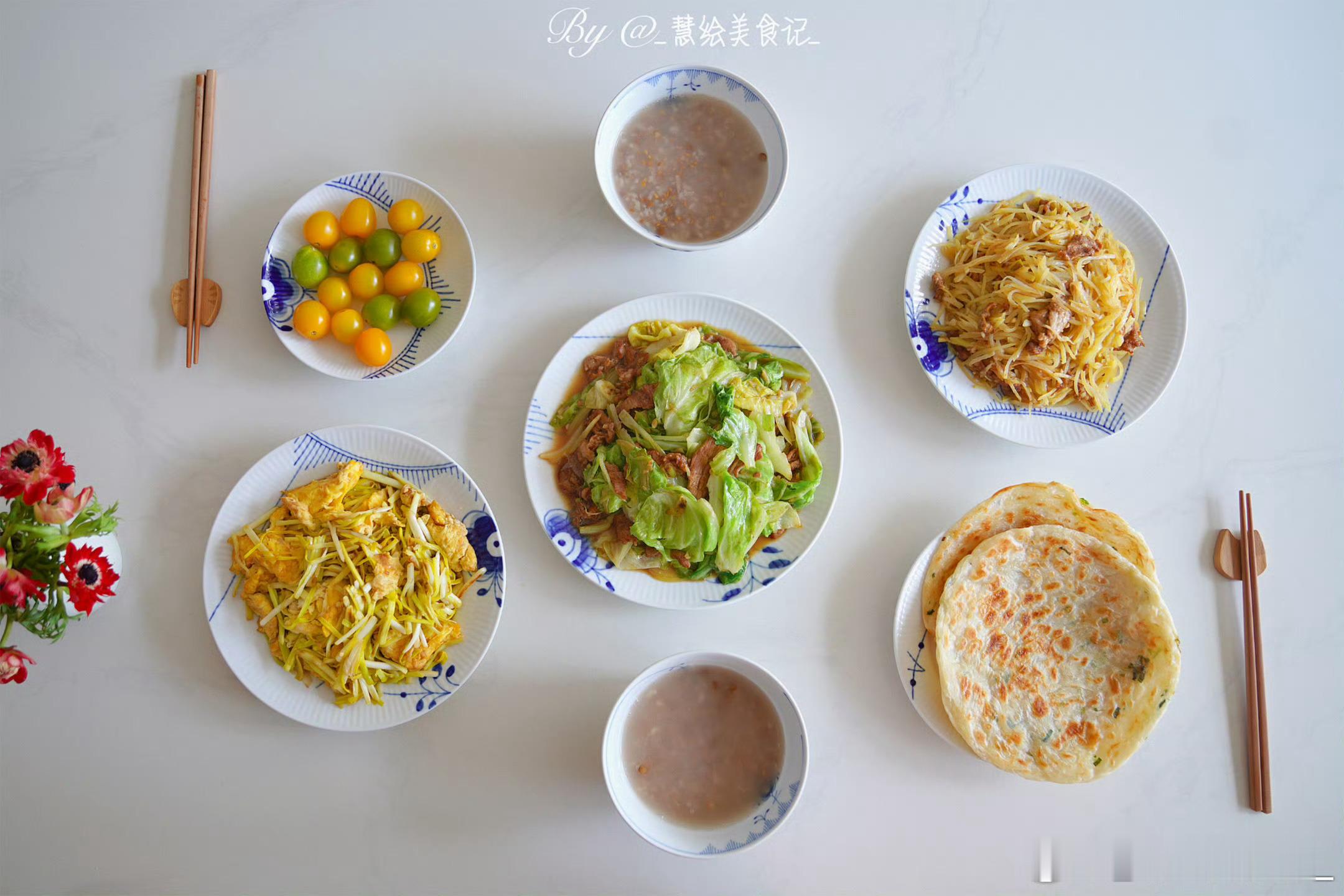 周四早餐绿甘蓝炒肉、蒜黄炒鸡蛋、土豆丝炒肉、手抓饼、绿豆粥、小番茄~我的美食日记