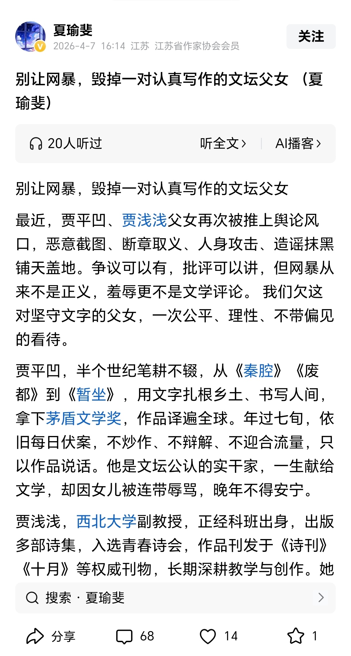 “作协会员”力挺贾平凹贾浅浅父女
