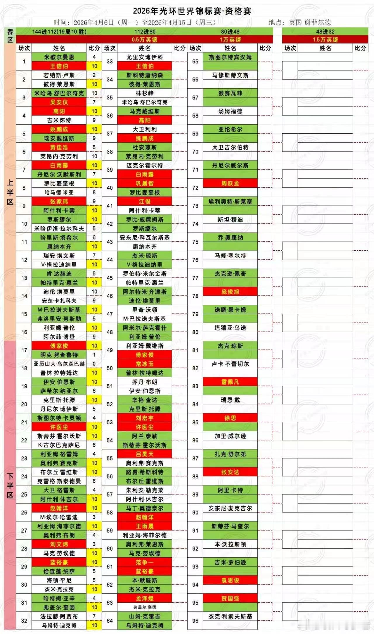 2026世界斯诺克世锦赛第三天 112进80中国选手白雨露、王信伯、高阳、姚鹏成、傅家俊、许医尘、蓝裕豪、赵瀚洋等八人晋级112;吴安仪、黄佳浩、张家玮、刘文炜等四人止步第一轮;2026.4.9日 星期三 19局10胜(9/10)17:00 直播: 江俊VS阿什利卡蒂 第一阶段 小窗: 利亚姆普伦VS阿米尔萨克霍什 第一阶段21:30 直播:王信伯VS博伊科 第二阶段 小窗:高阳VS马克戴维斯 第二阶段