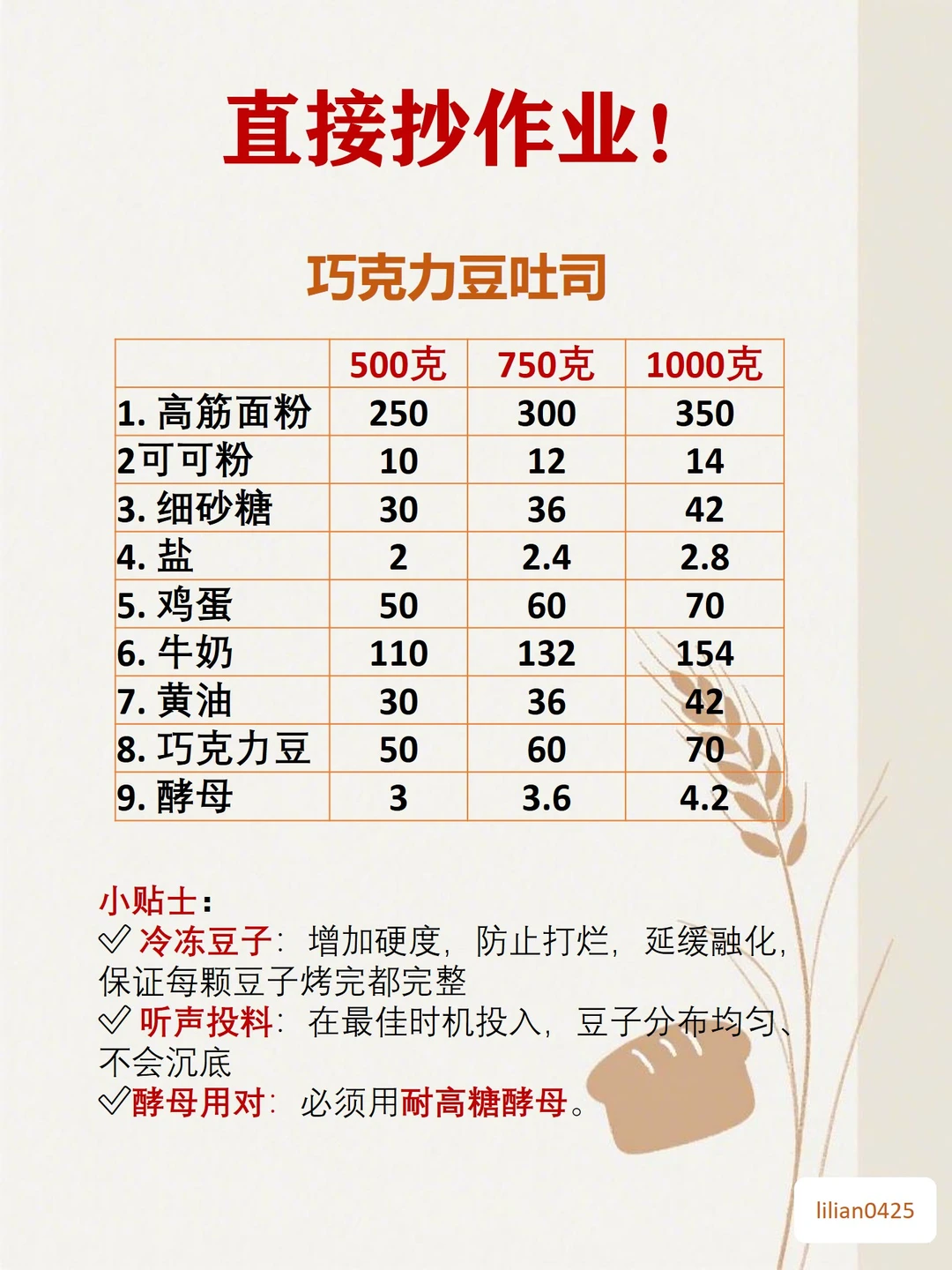 我把500g/750g/1000g面包机对应的巧克力豆吐司的配方都算好了!