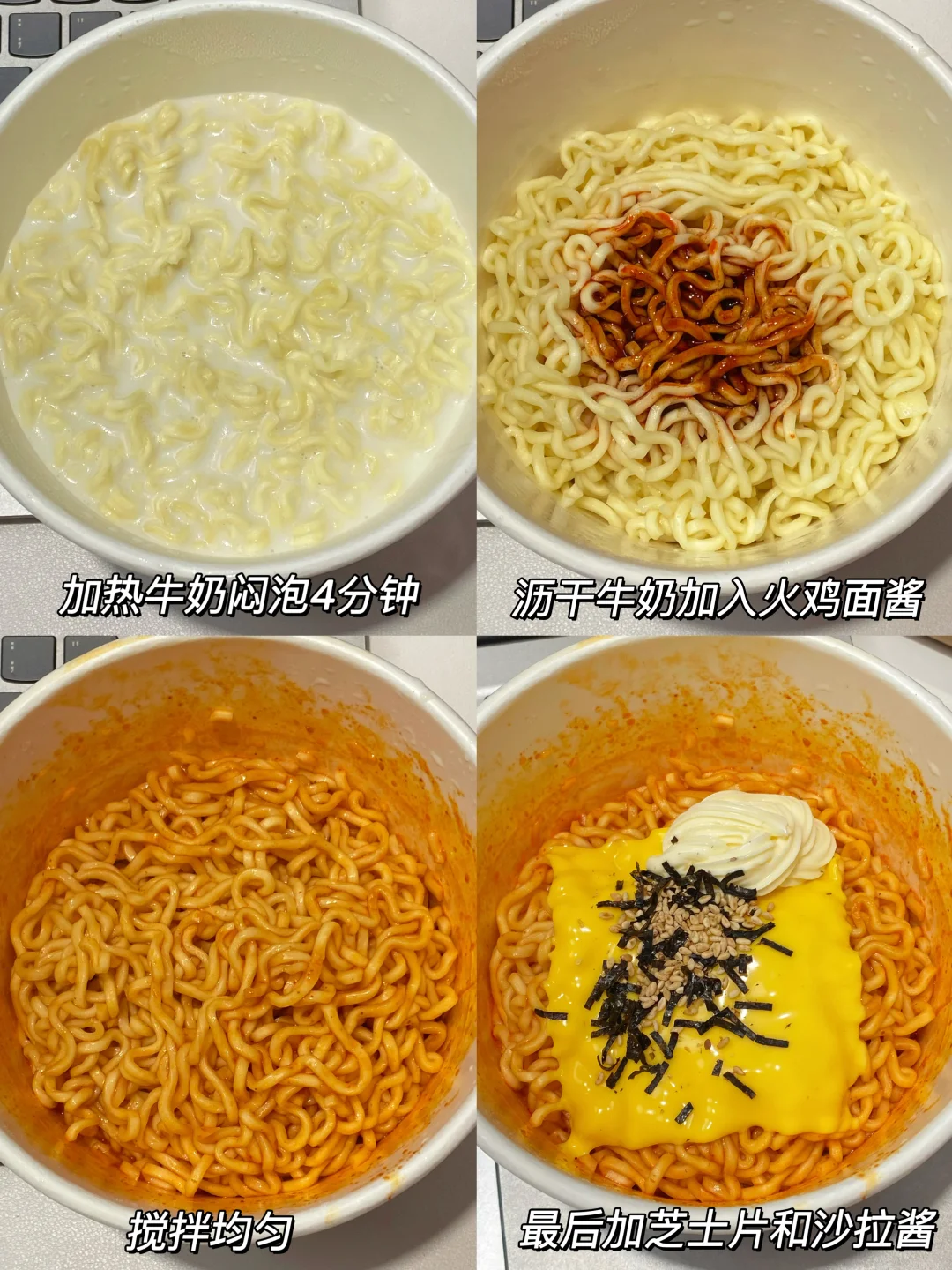 用热牛奶泡面,滤出牛奶再把调味包加进去,一直搅拌!
