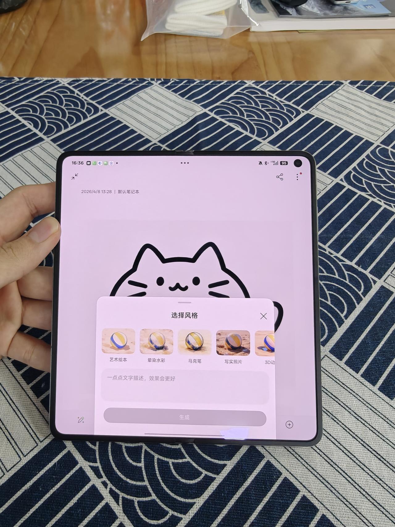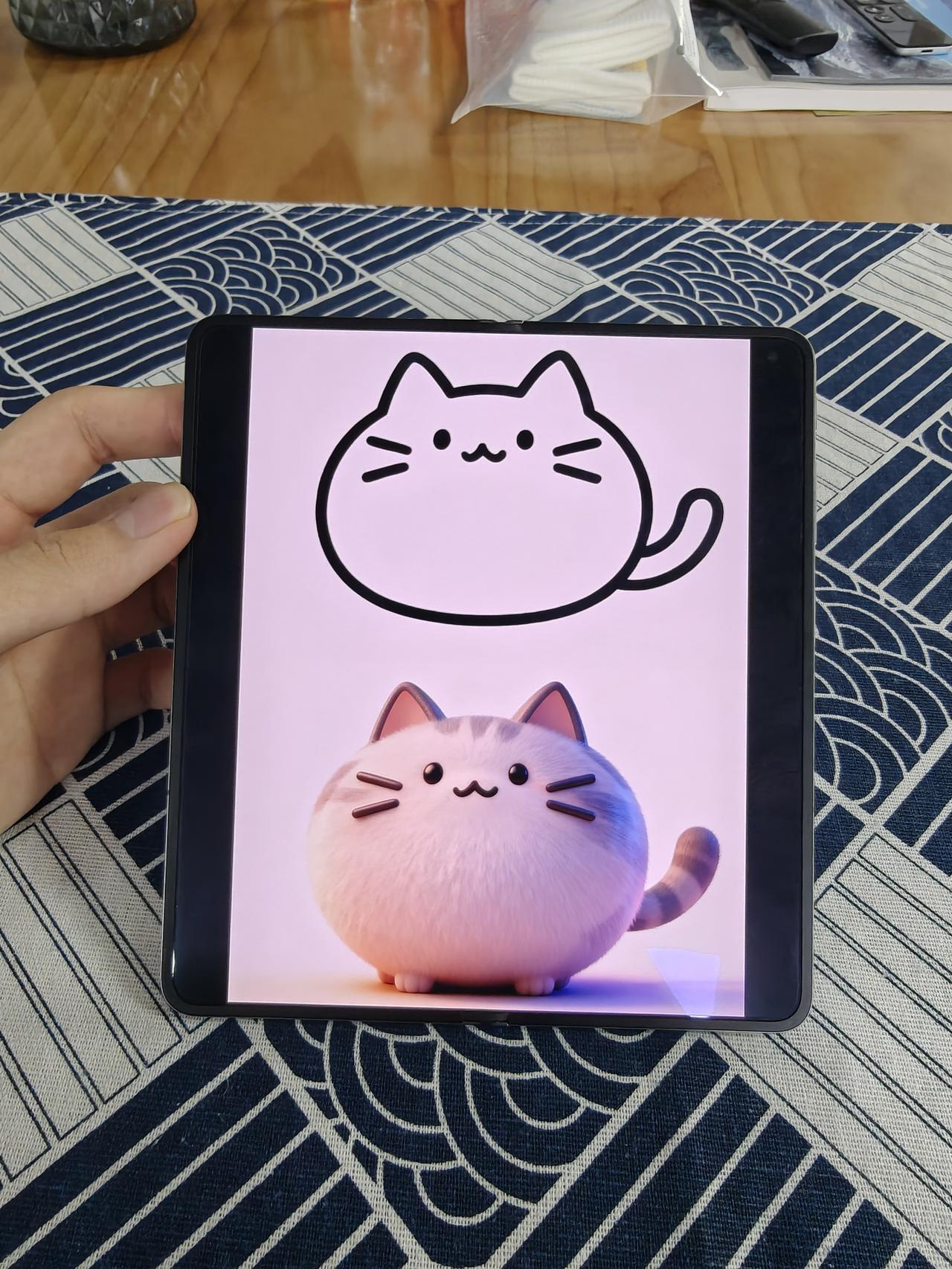 当然,除了折痕,Find N6好多地方也是出色的,哈苏2亿像素四摄,拍照是折叠屏里领先的,我还很喜欢N6的AI功能,配个手写笔,能写能画能用AI绘图,像随手画个小猫就能生成好看生动的猫猫🐈,到时候不知道苹果折叠屏有啥好用的功能?