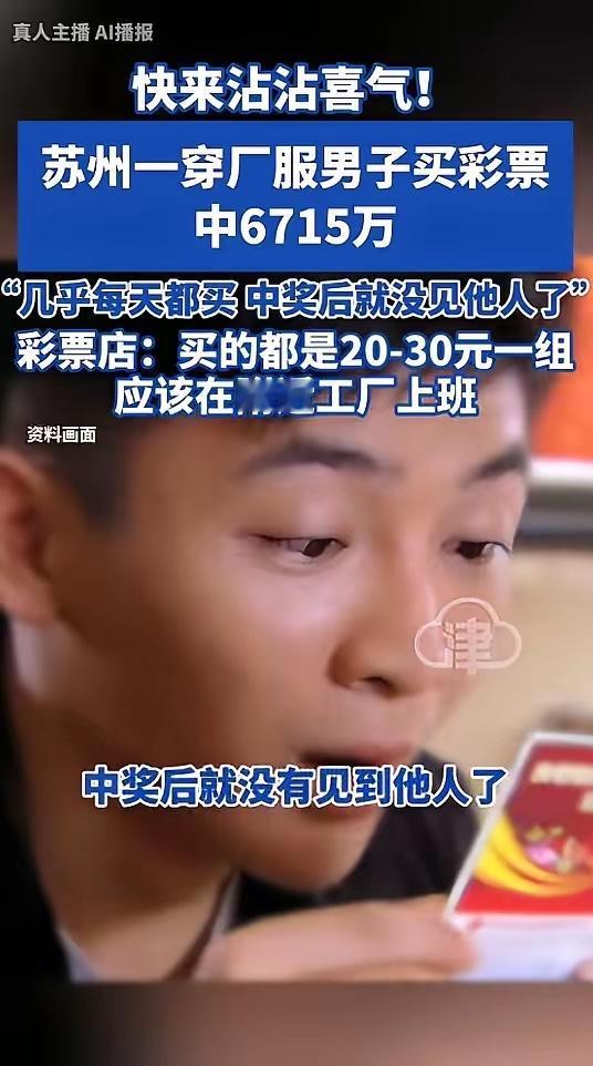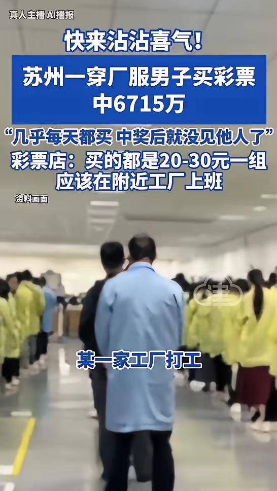 “这就是命啊!”江苏苏州,一男子几乎每天穿着厂服,到一家彩票店买彩票,并且买的挺大,基本都是20—30元一组,没想到这次男子直接中了6715万元!彩票店老板表示,自从男子中了奖后,就再也没见过他!网友:这才是真正的“提桶跑路”!