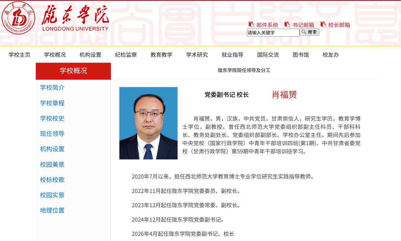 据悉,肖福赟此前已在陇东学院任职多年,先后担任副校长、副书记等职,对学校情况有着深入了解,此次履新校长,可谓是熟门熟路、众望所归。