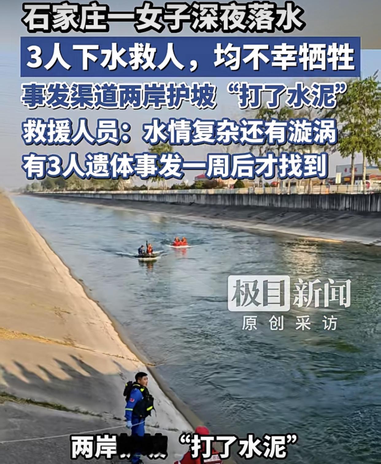 近日,河北石家庄晋州石津总干渠晚上11点左右,一名女子不知什么原因掉落河渠,附近开烤鱼店的老板和店里的厨师,以及附近巡逻的一名辅警闻讯赶来,先后跳入河渠营救。无奈水流湍急,渠坡长满了青苔再加上陂度又陡,最终4人都被冲走。当地打捞队员经过7天7夜打捞,终于在下流12公里处将4人全部打捞上岸,结局让所有在场的人心碎一地。