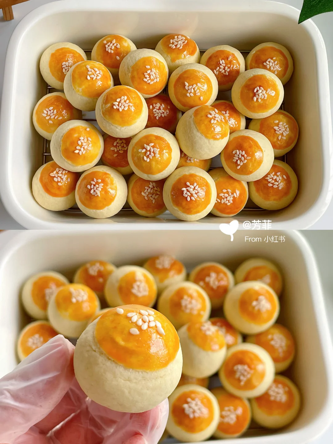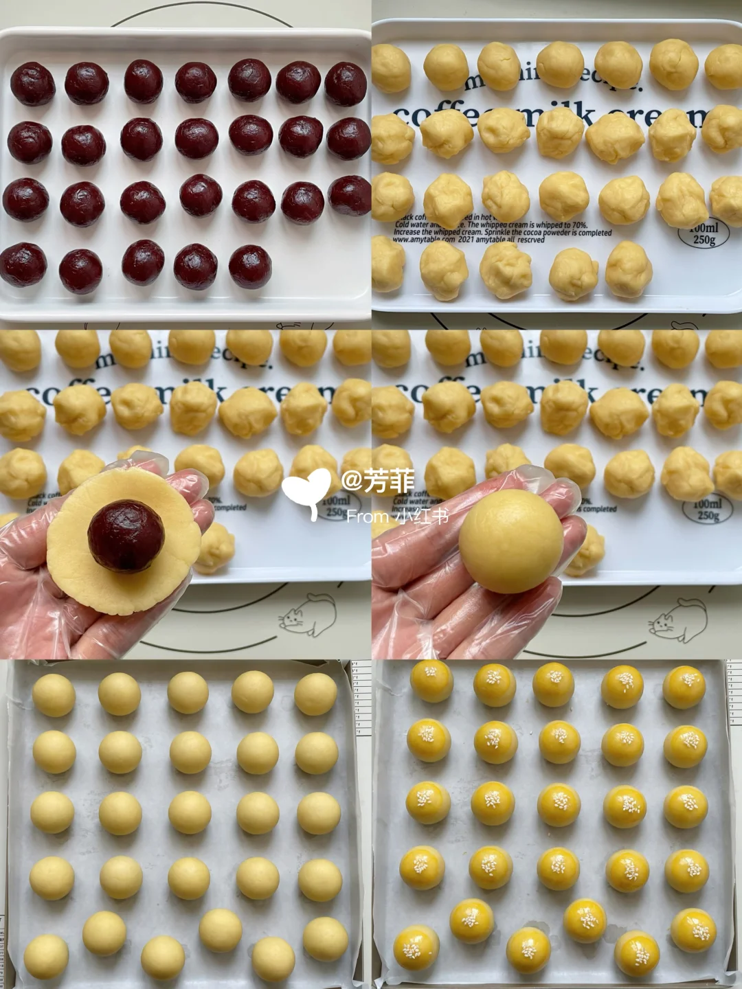 3️⃣手掌微弯托起边转边捏,利用虎口包拢捏紧收口滚圆.将收口处朝下间隔摆入烤盘,表面刷蛋黄液撒芝麻⚠️曲奇酥皮面团包馅不是直戳戳的包,利用手掌和虎口,托起轻捏推压着面团延伸包拢,能避免开裂