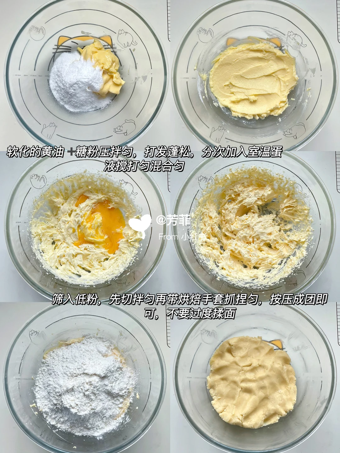1️⃣准备好食材,黄油软化到牙膏状,加糖粉压拌匀,打发蓬松.分次加入室温蛋液搅打匀混合匀. 筛入低粉,先切拌匀再带烘焙手套抓捏匀,按压成团不要过度揉面⚠️黄油面团会因天气变化软硬度不同,天冷利用手温抓捏匀即可
