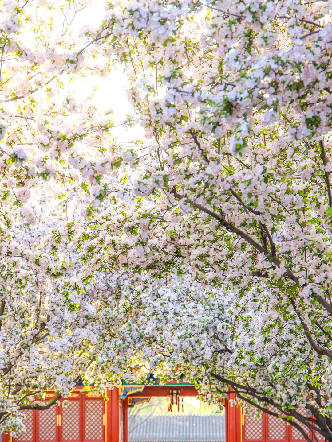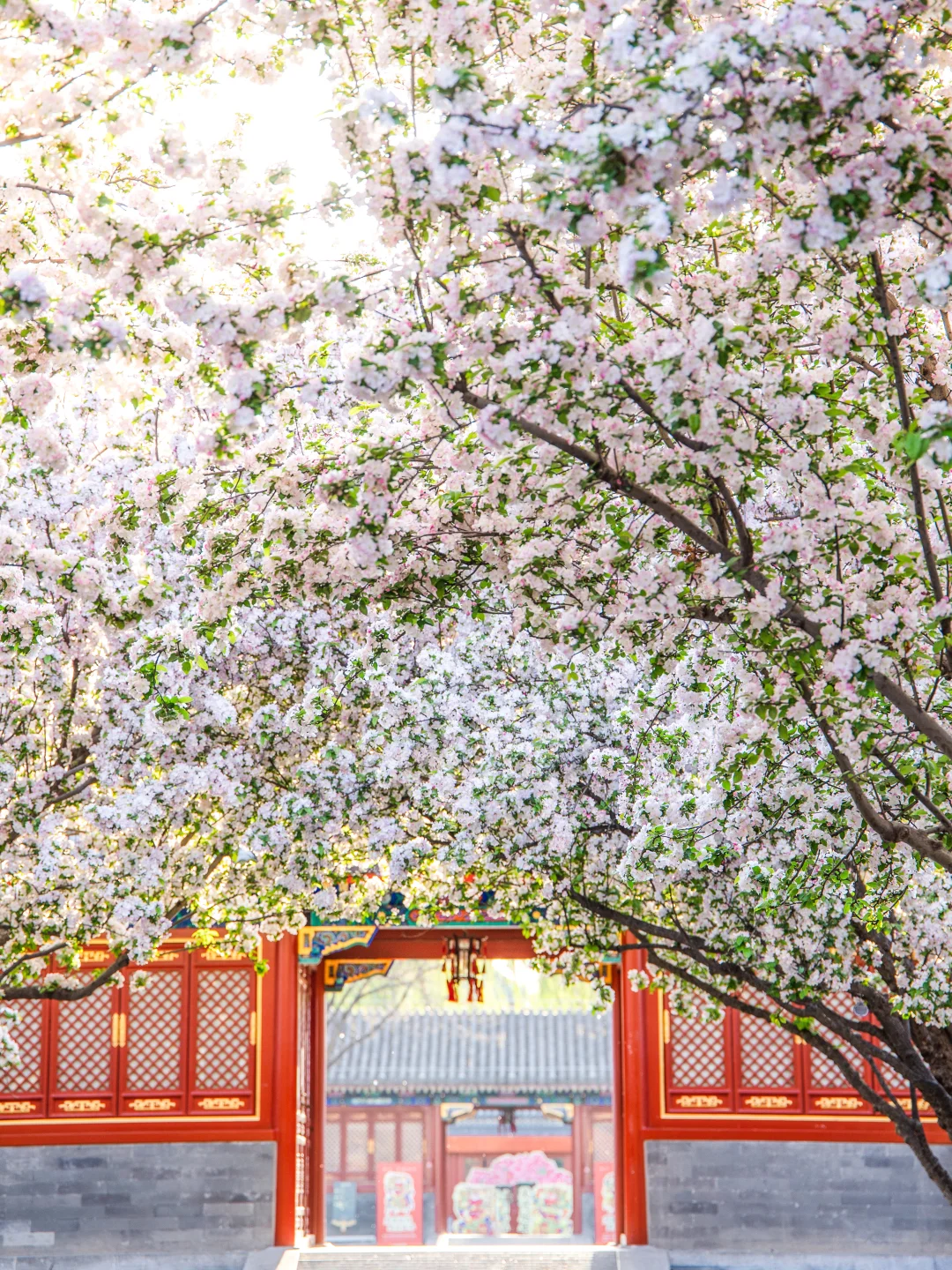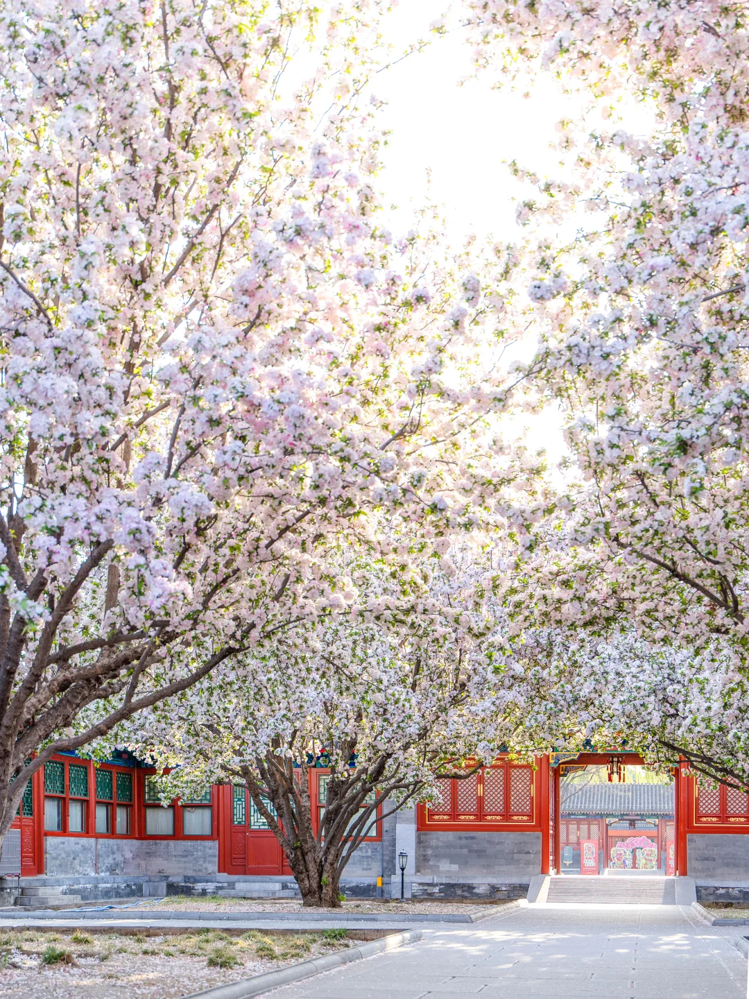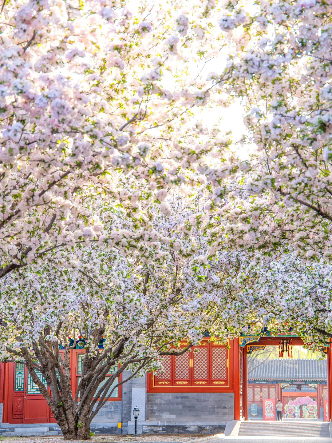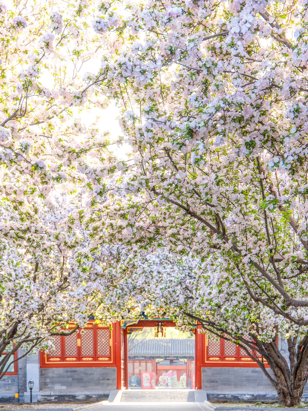 恭王府的西府海棠开得正盛,所以也少不了人。由于其位置是在检票口进门的右手边,所以第一站就去了那。但人很多,拍摄时角度只能往上提,午后的光线也不好 ,在树下满心欢喜地看了会儿,就去里面逛了,一直逛到保安们开始清场了,才往出走(恭王府的保安好好,我知道应该按规在清场时立刻退场,但作为一个喜欢摄影的人,谁能忍住在人群退去、又是在夕阳的光线下不去拍一张照片啊!但保安都没有催,还笑呵呵地等我们几个拍完,谢谢他们!) 。等返回路过一处大门时,看见大家都蹲在地上不知道在拍什么,于是爱凑热闹的我也过去了,原来是在拍西府海棠!于是我也趴着地缝拍到了几张人群散去的海棠花,夕阳光下真的好美!