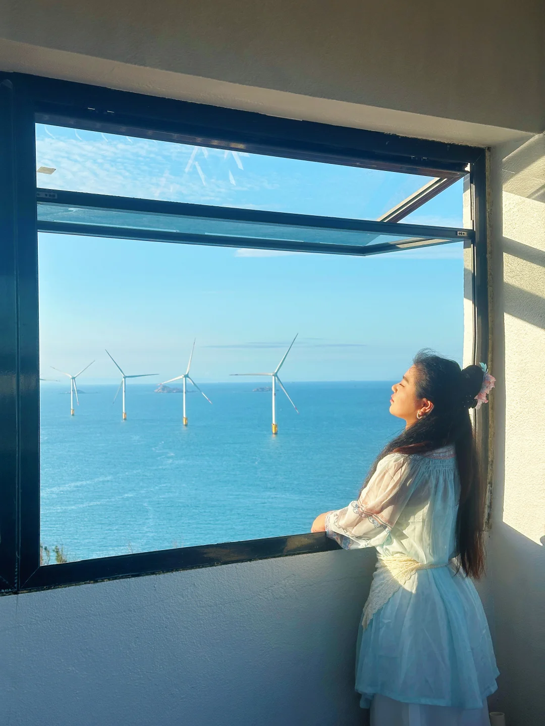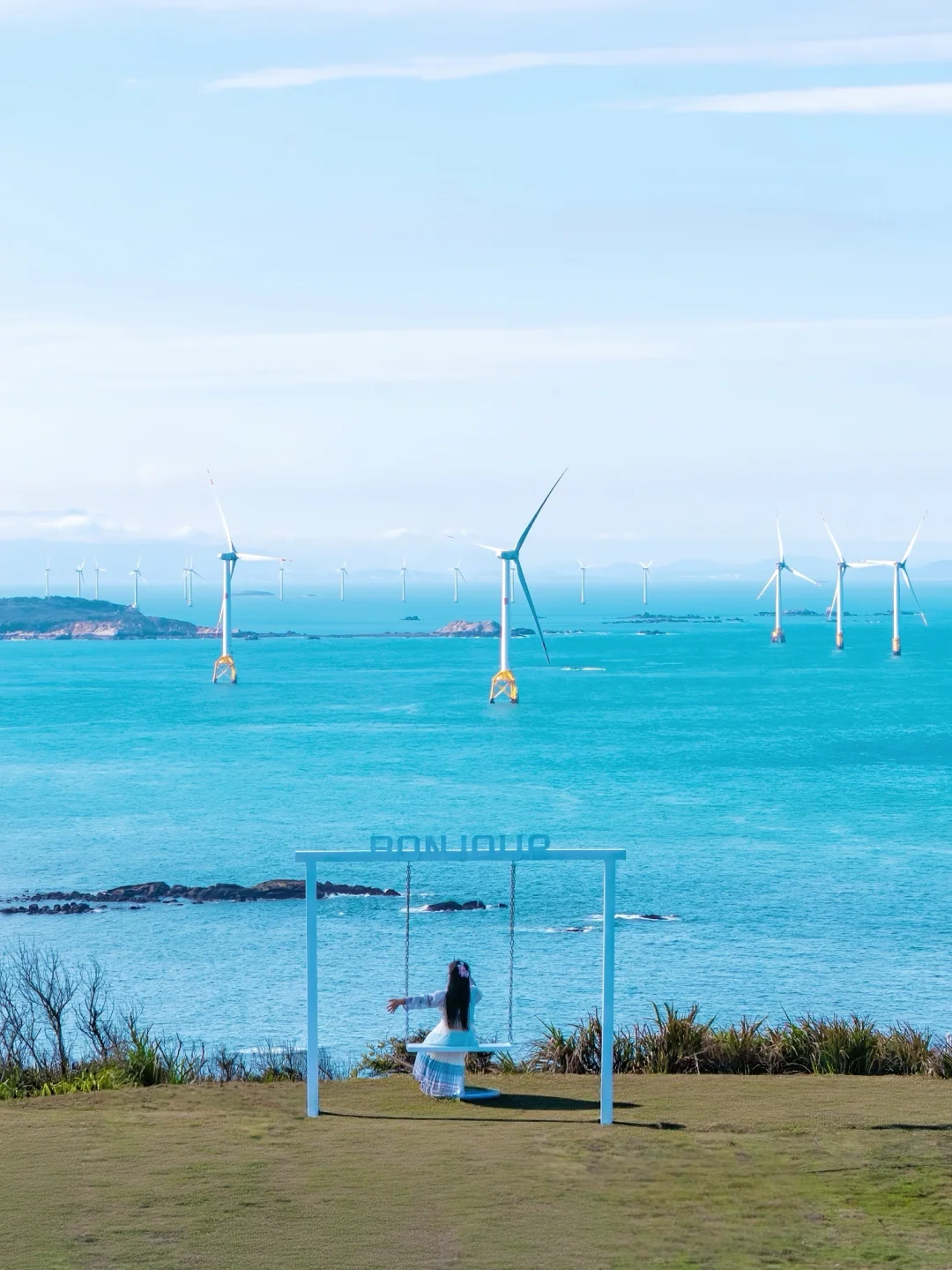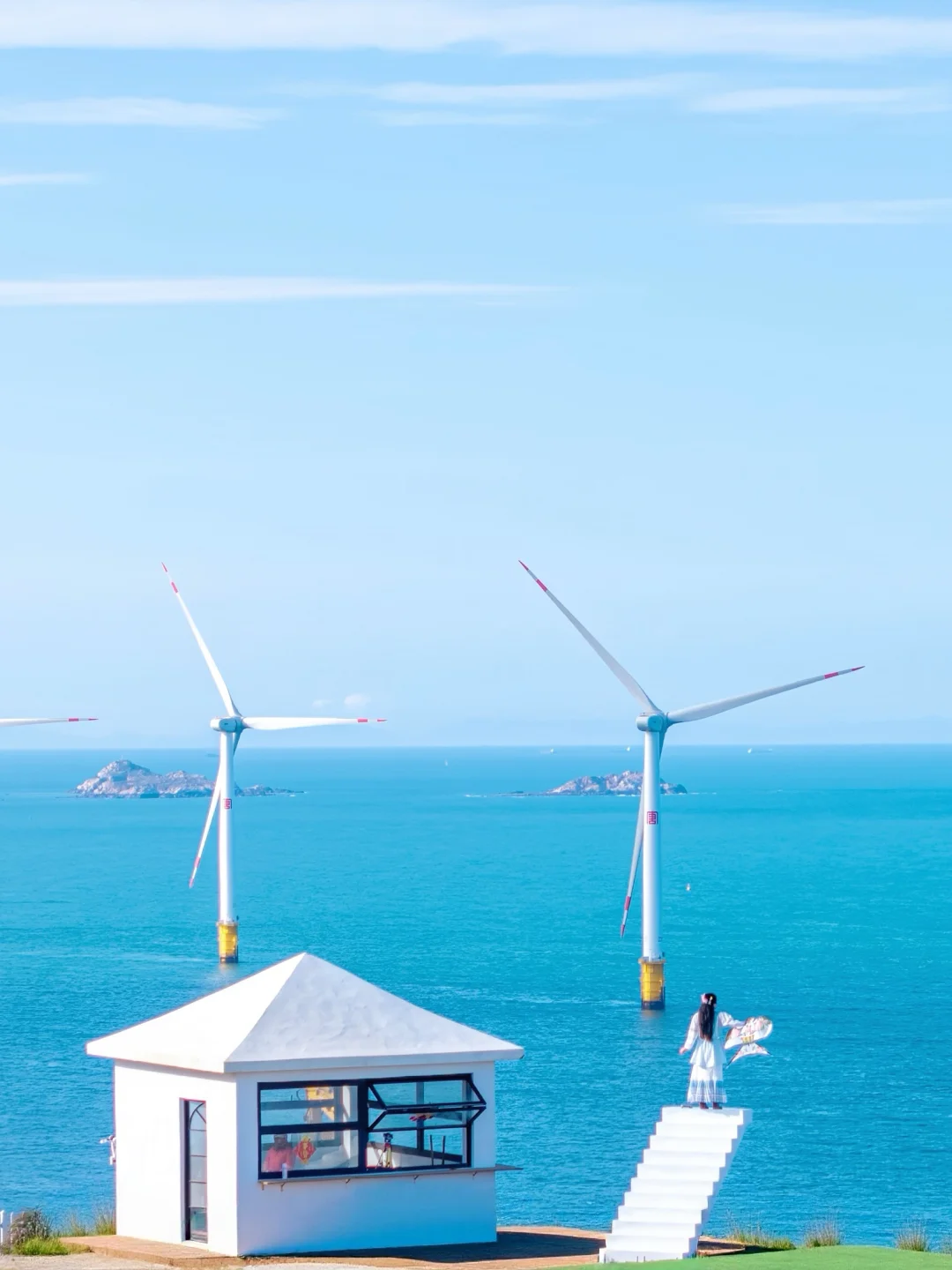 静静站在蔚蓝海面上,巨大的叶片慢悠悠划过天际,感觉整片海都在写信,海风就是那个浪漫的信使✉️