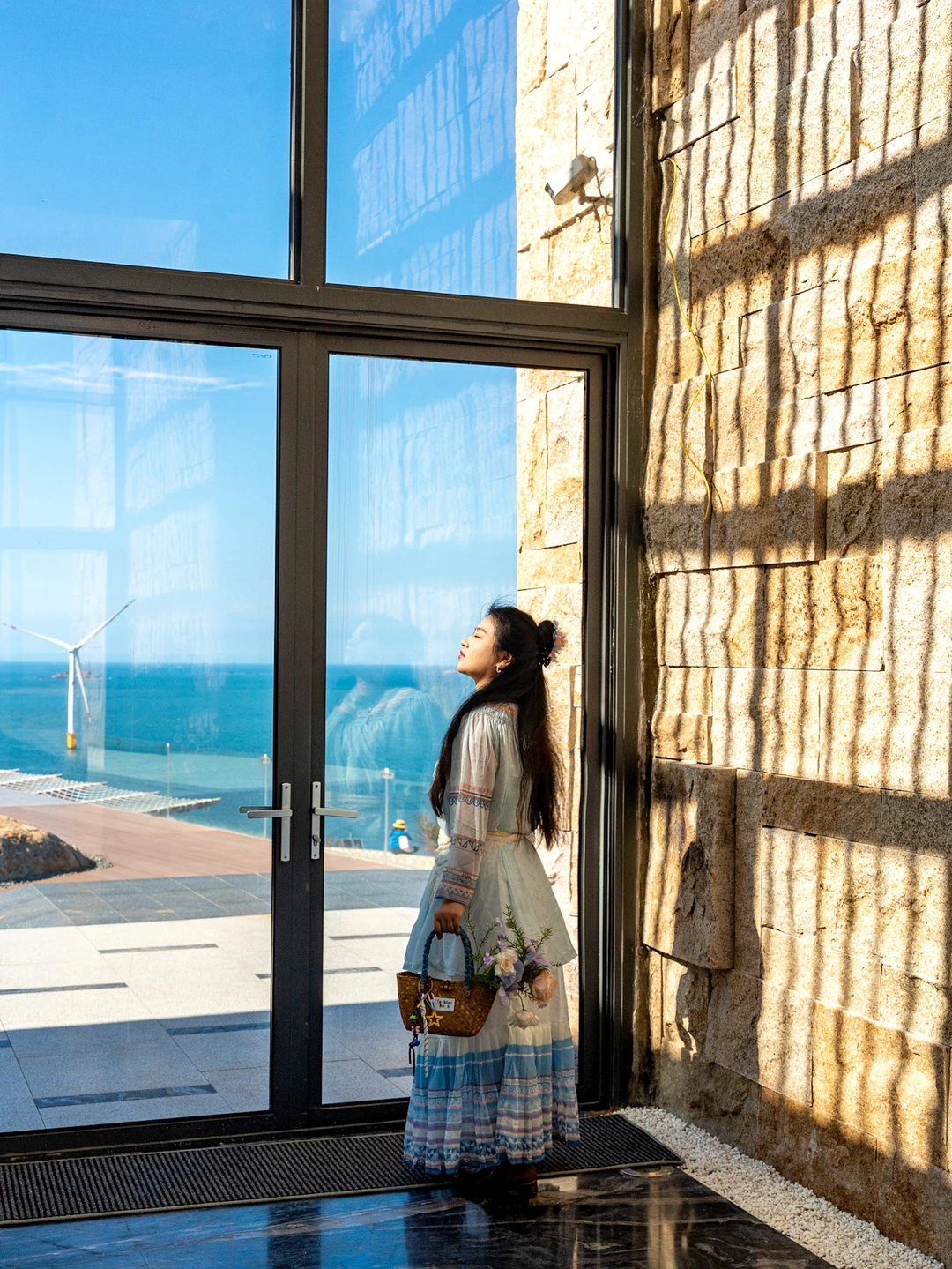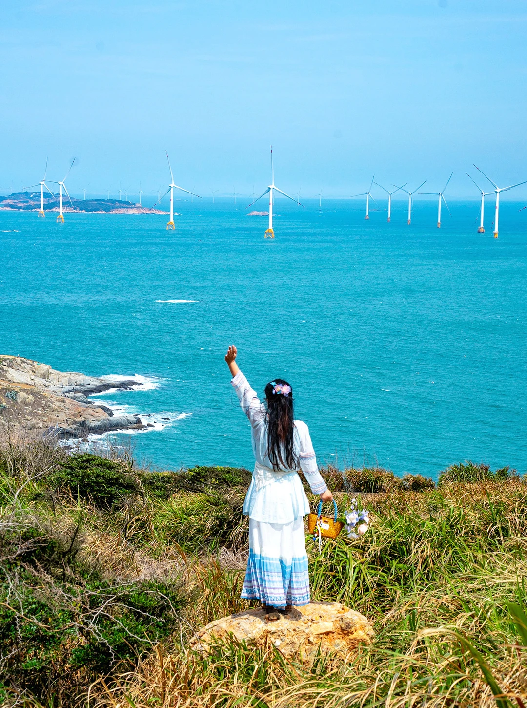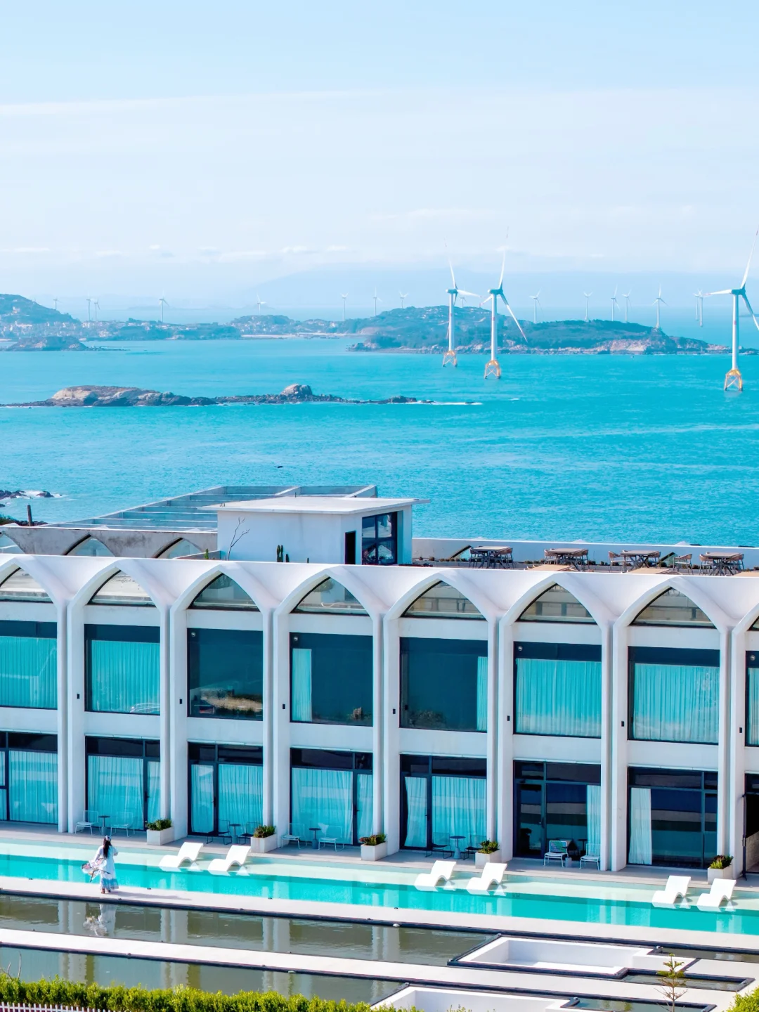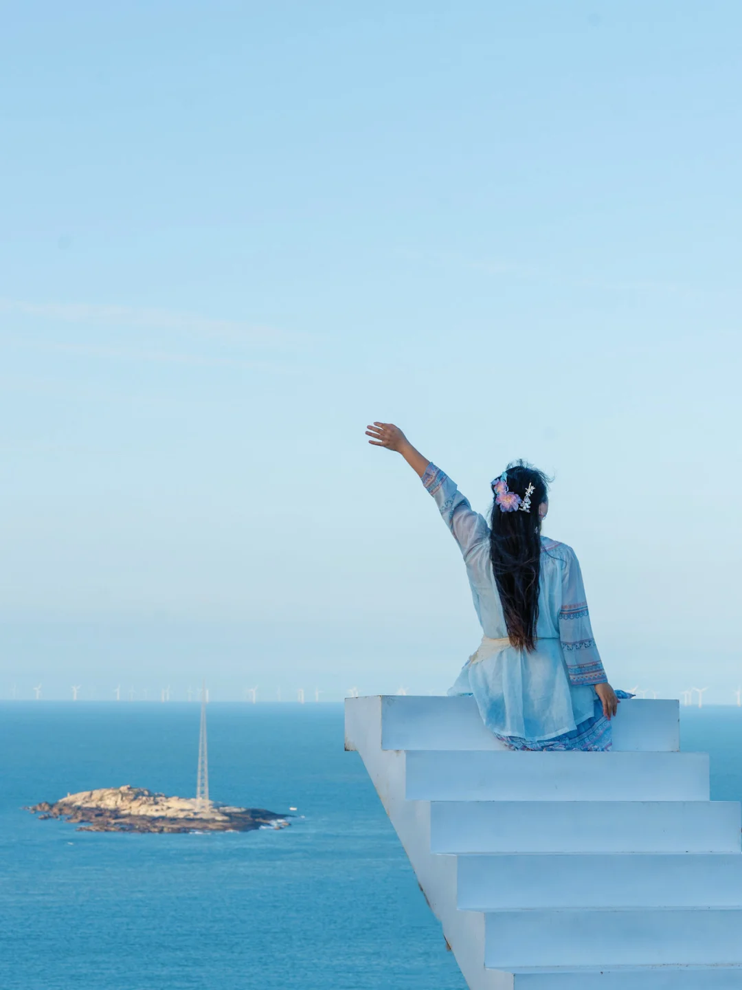 静静站在蔚蓝海面上,巨大的叶片慢悠悠划过天际,感觉整片海都在写信,海风就是那个浪漫的信使✉️