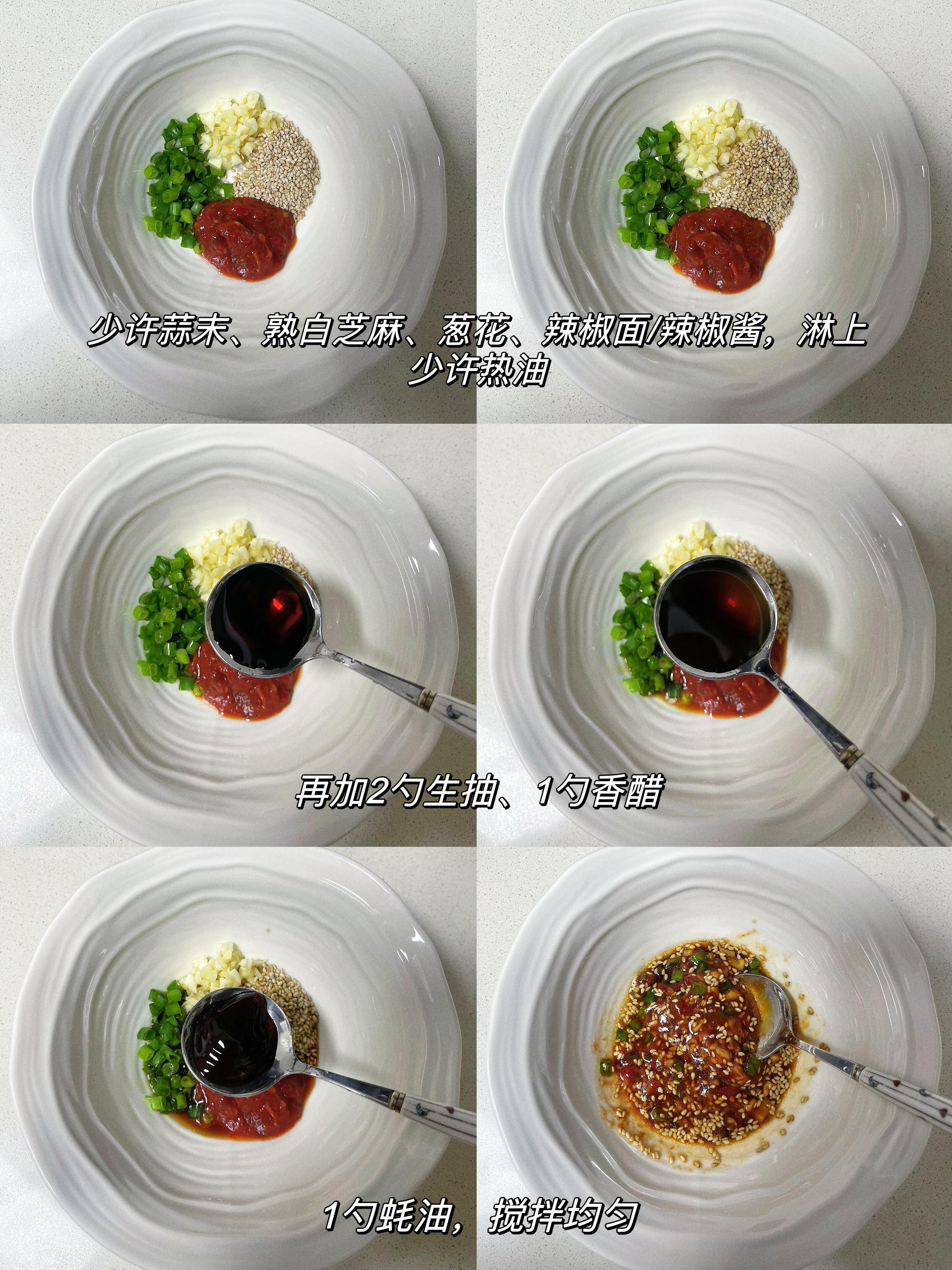 1️⃣ 碗中放入蒜末、葱花、芝麻,再加入辣椒酱(或辣酱面),浇上一勺滚烫热油,瞬间激出浓郁香味;