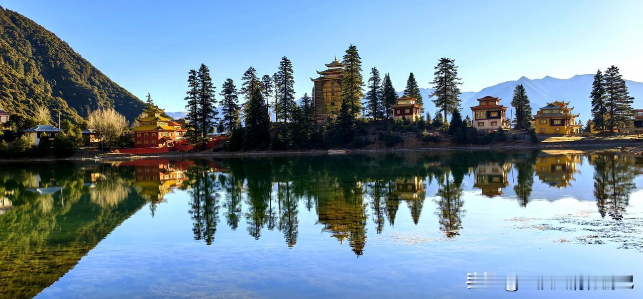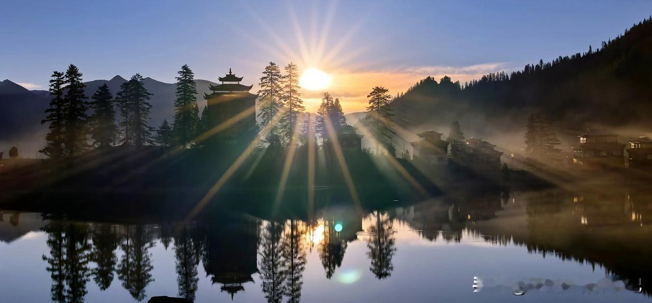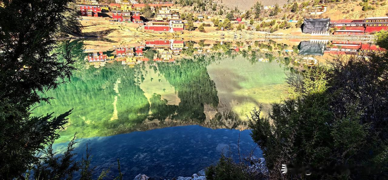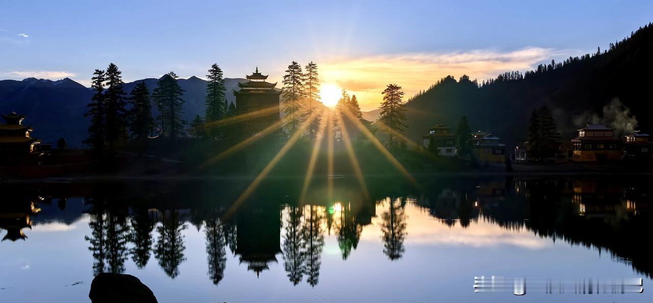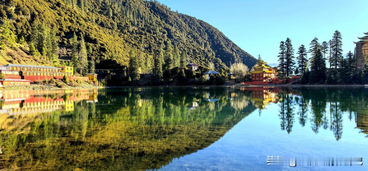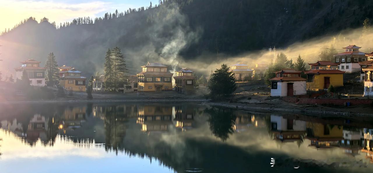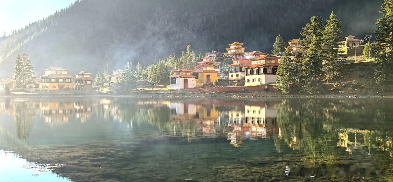 波澜不惊的湖水,平静如镜面,映衬环湖而建红墙金顶、华丽精美、造型古朴的措卡寺,晨钟暮鼓、梵音袅袅声中,一轮红日自高山之巅缓缓升起,橙红的暖阳映照烈烈经幡、飘渺桑烟,庄重的寺庙与宁静的湖面,刹时朦胧成一幅虚幻迷离的世外仙境,真的令人恍若置身九天之外!