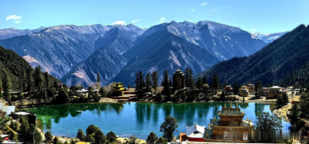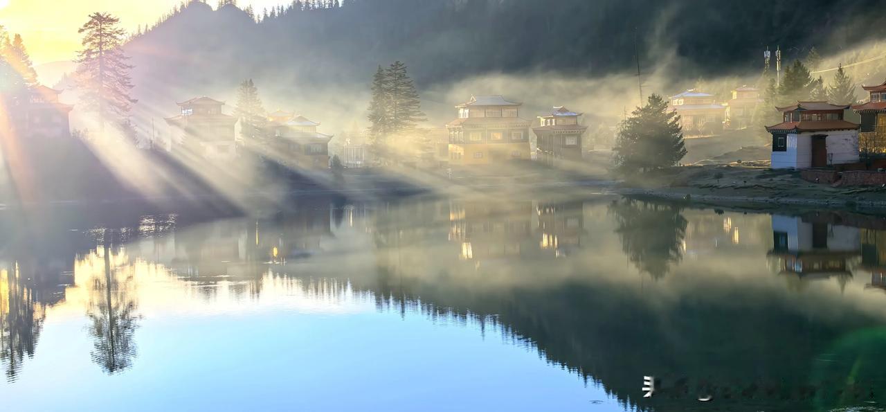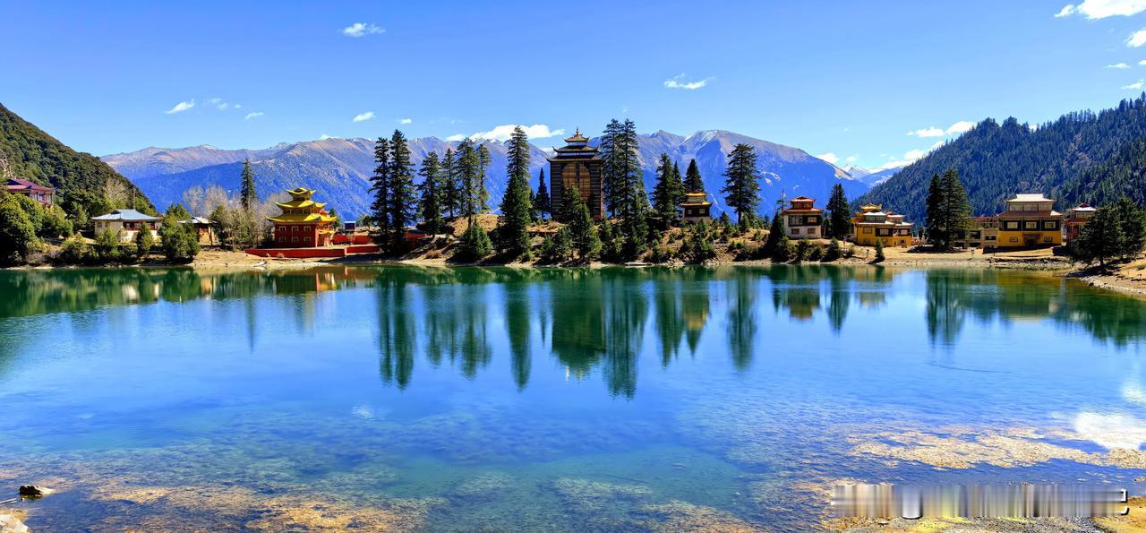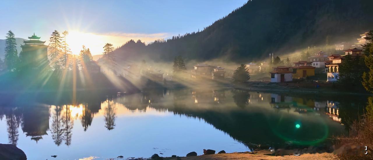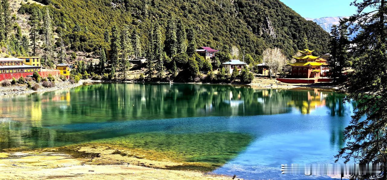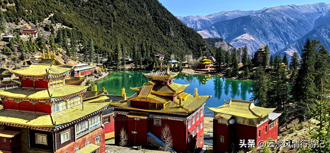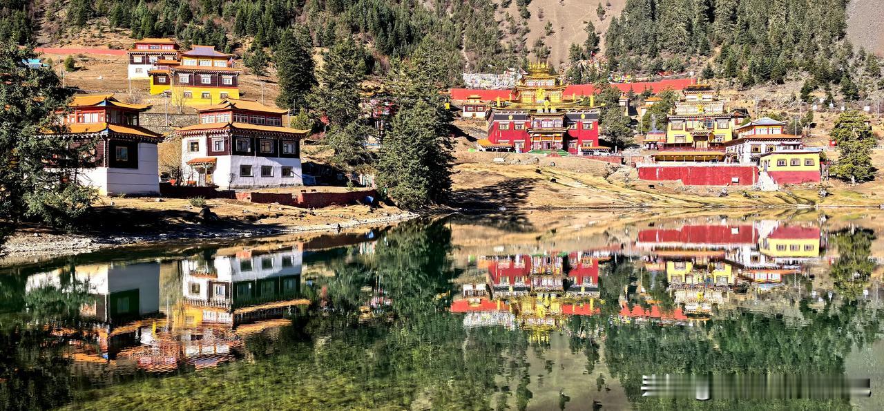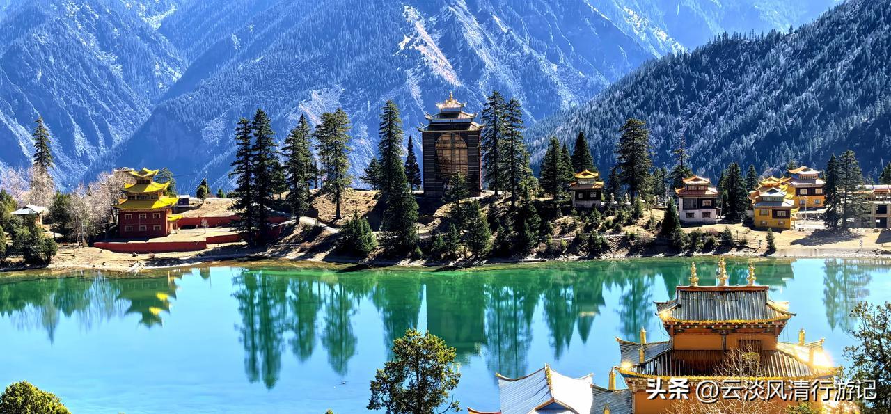 波澜不惊的湖水,平静如镜面,映衬环湖而建红墙金顶、华丽精美、造型古朴的措卡寺,晨钟暮鼓、梵音袅袅声中,一轮红日自高山之巅缓缓升起,橙红的暖阳映照烈烈经幡、飘渺桑烟,庄重的寺庙与宁静的湖面,刹时朦胧成一幅虚幻迷离的世外仙境,真的令人恍若置身九天之外!