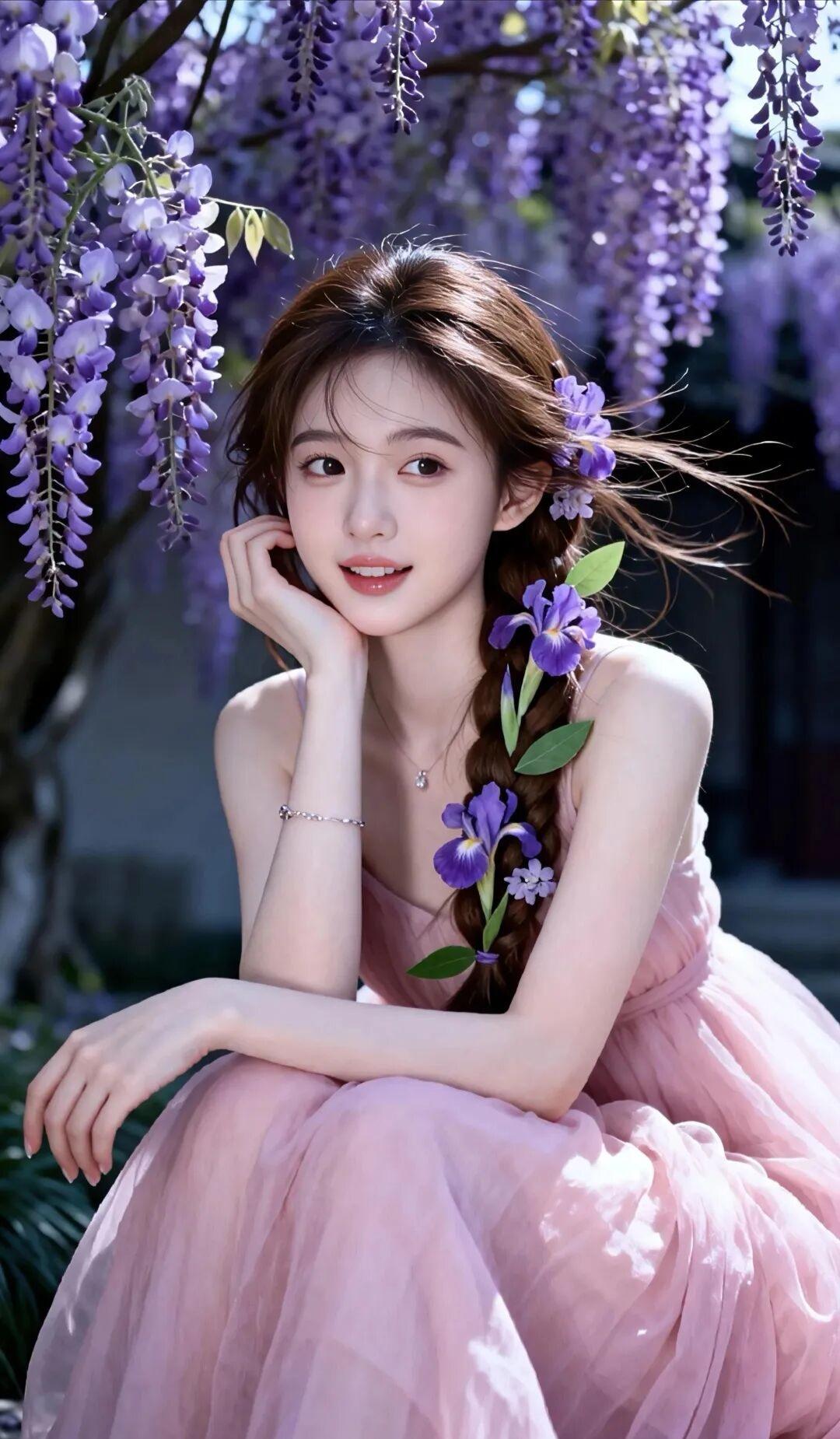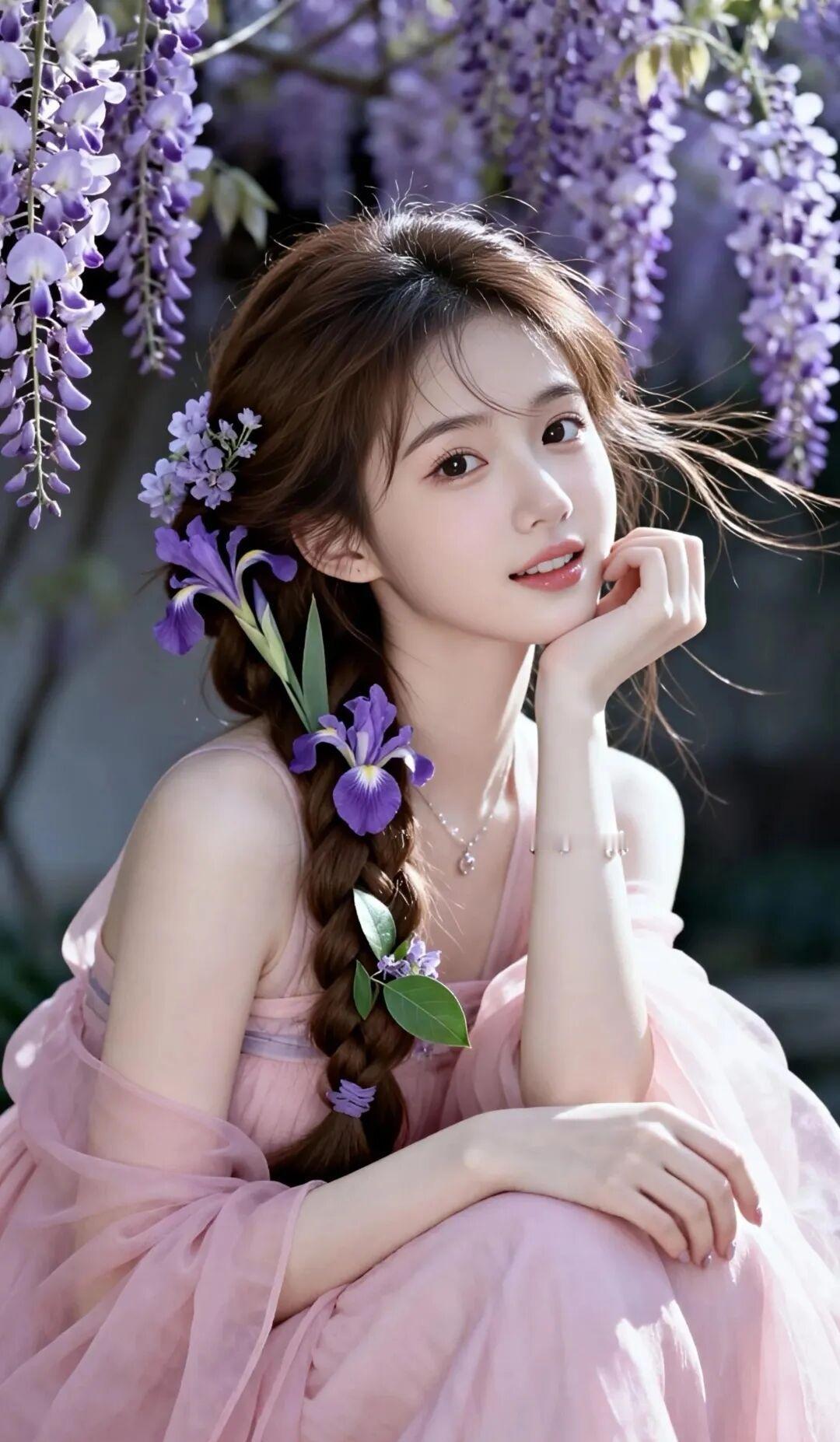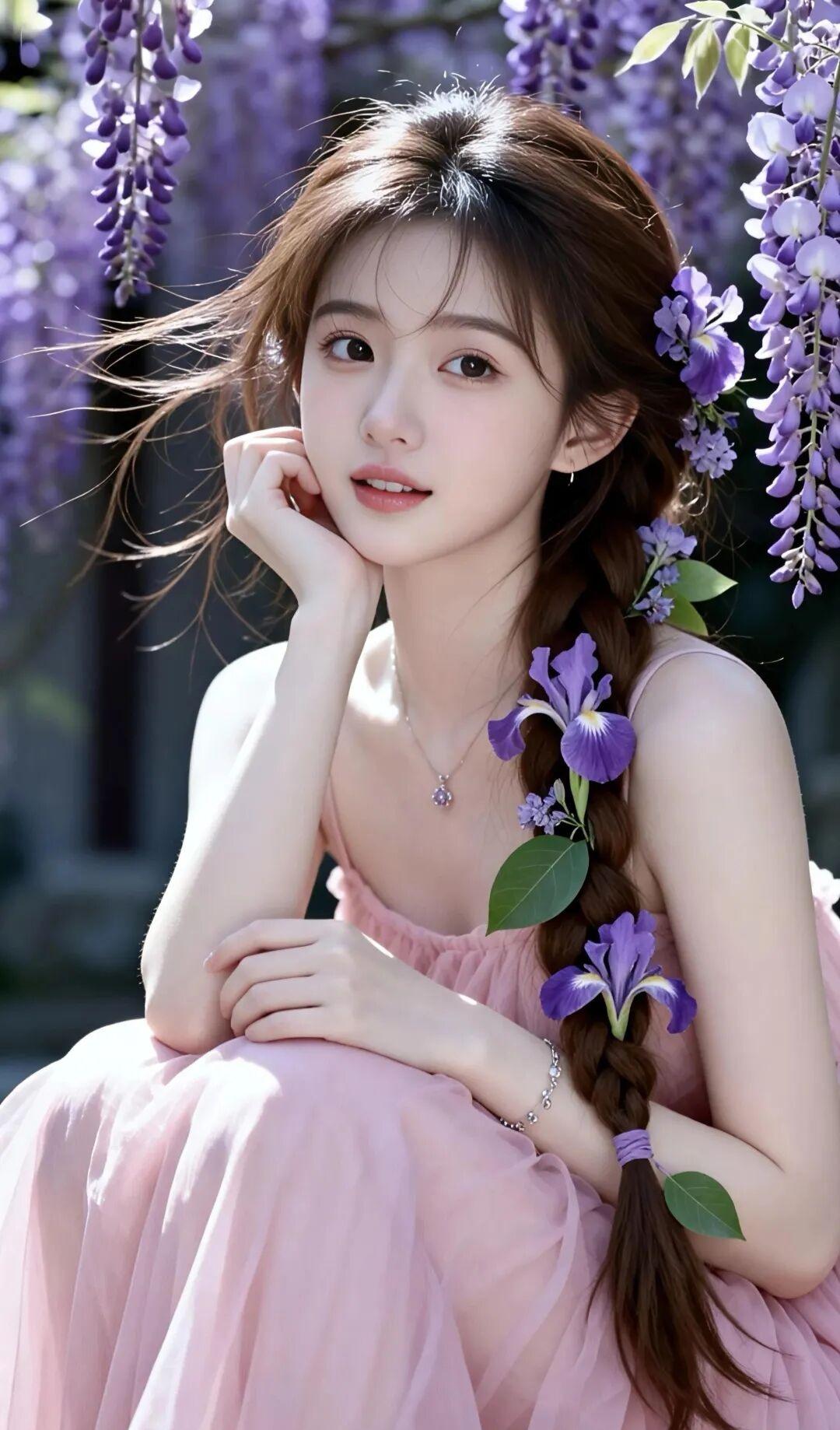 发型:一头柔顺的深棕长发被编织成精致的侧边麻花长辫,随性垂落肩头。发间精心点缀了紫色的鸢尾花与嫩绿枝叶,还有细碎的小花缠绕其中,与背景的紫藤花遥相呼应,清新又浪漫。