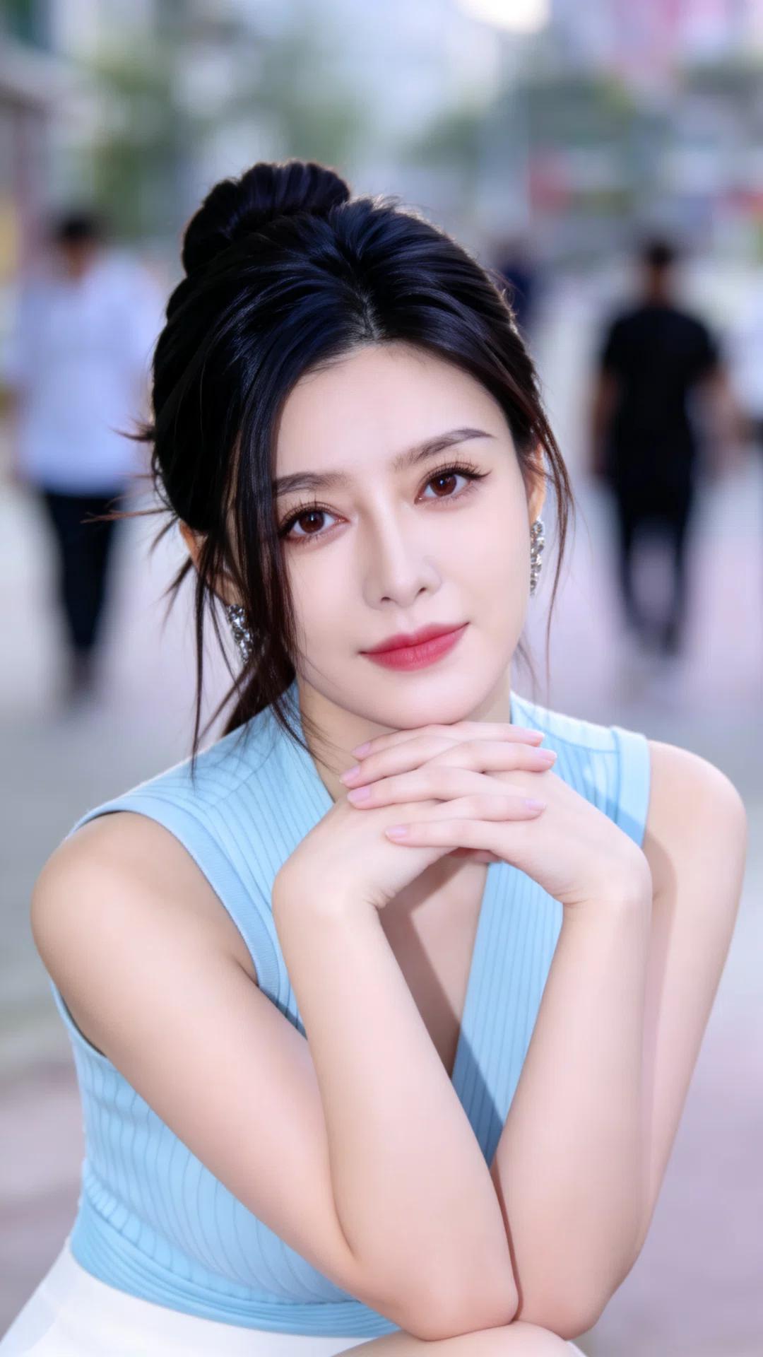 气质成熟明艳的御系美女,五官精致立体,眉眼妩媚温柔,氛围感红唇明艳大气,五官精致耐看,优雅又自带温柔御姐气场。乌黑长发利落盘成慵懒高丸子头,碎发修饰脸型,干练又精致。