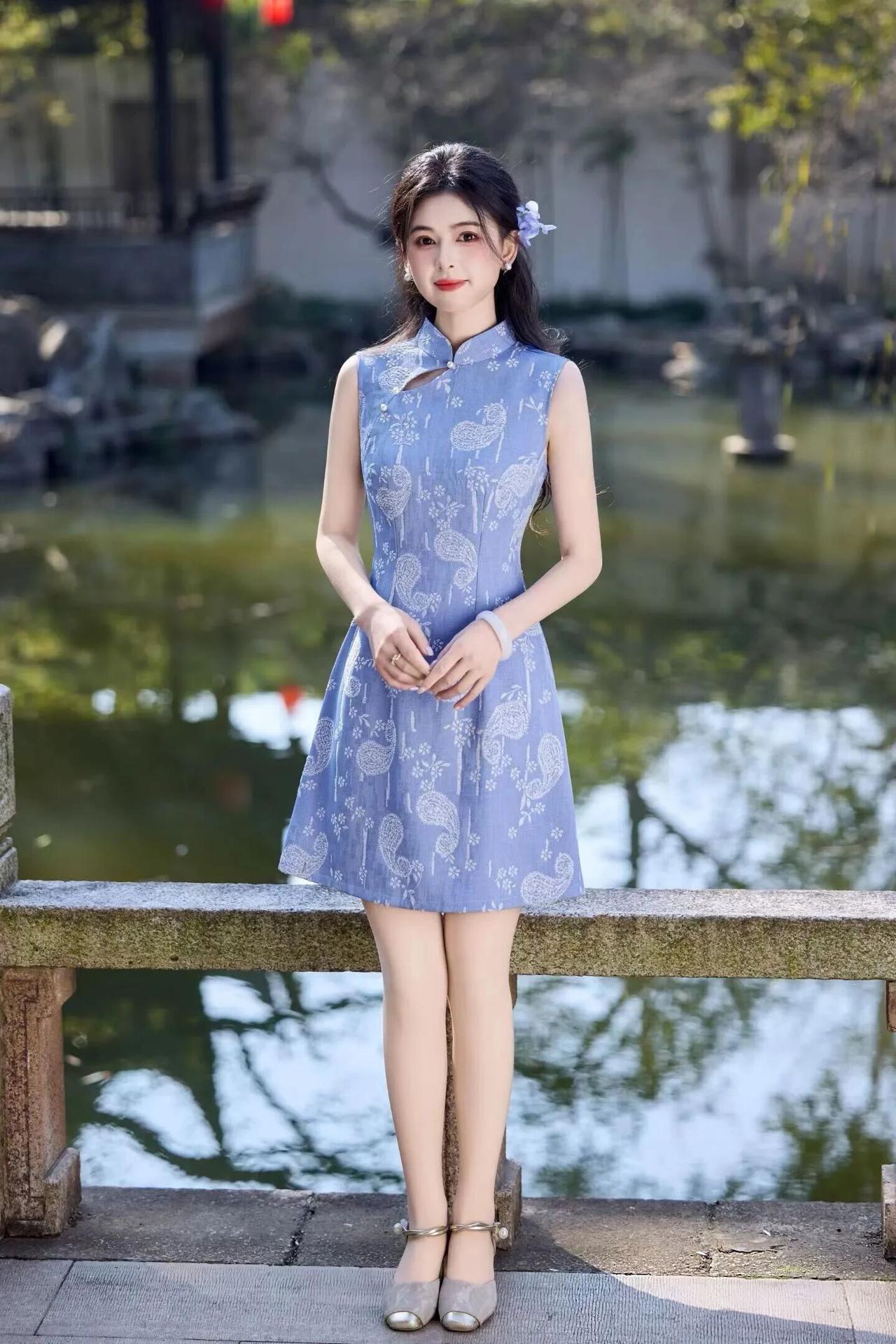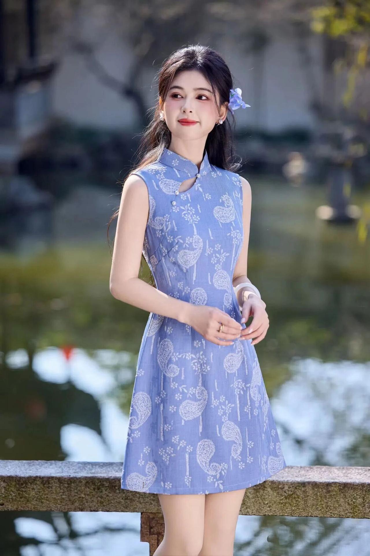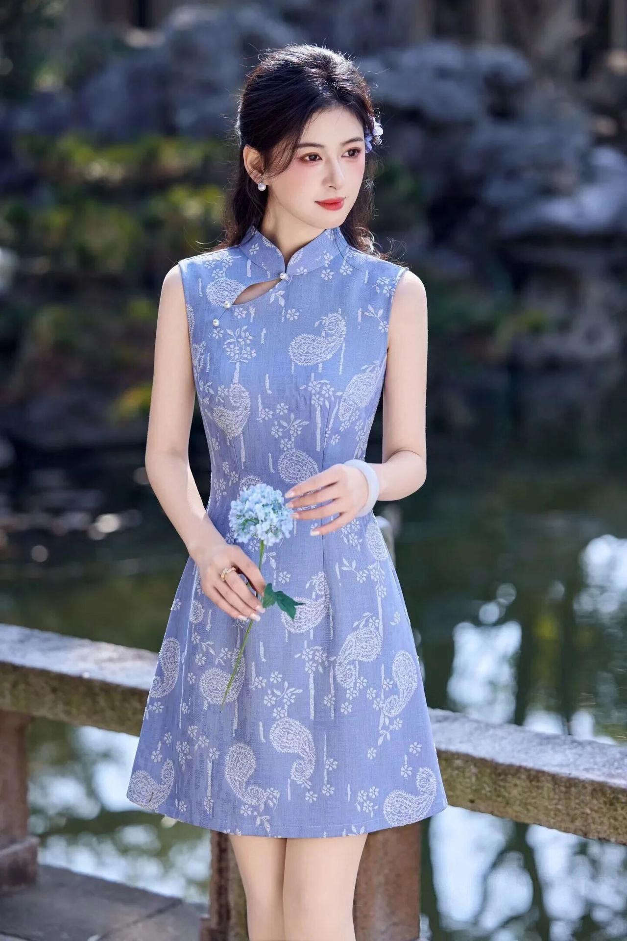 一身雾蓝无袖改良短款旗袍,清冷治愈的莫兰迪蓝底色,搭配精致白色暗纹提花,复古立领+温婉小心机镂空盘扣,完美复刻中式古韵;A字短裙版型灵动减龄,利落无袖设计清爽秀气,温柔勾勒曼妙身姿,弱化传统旗袍的成熟感,自带清甜少女氛围感。