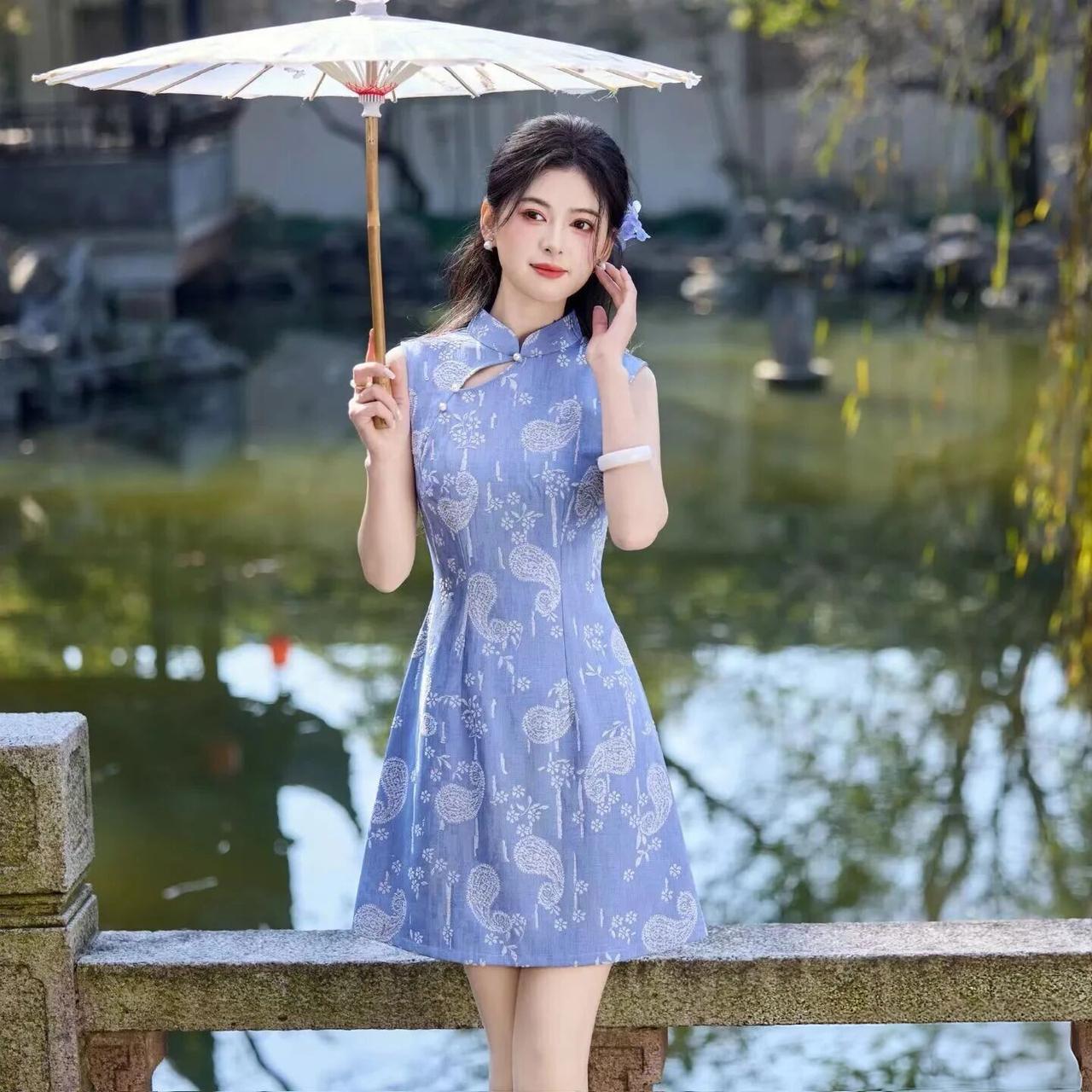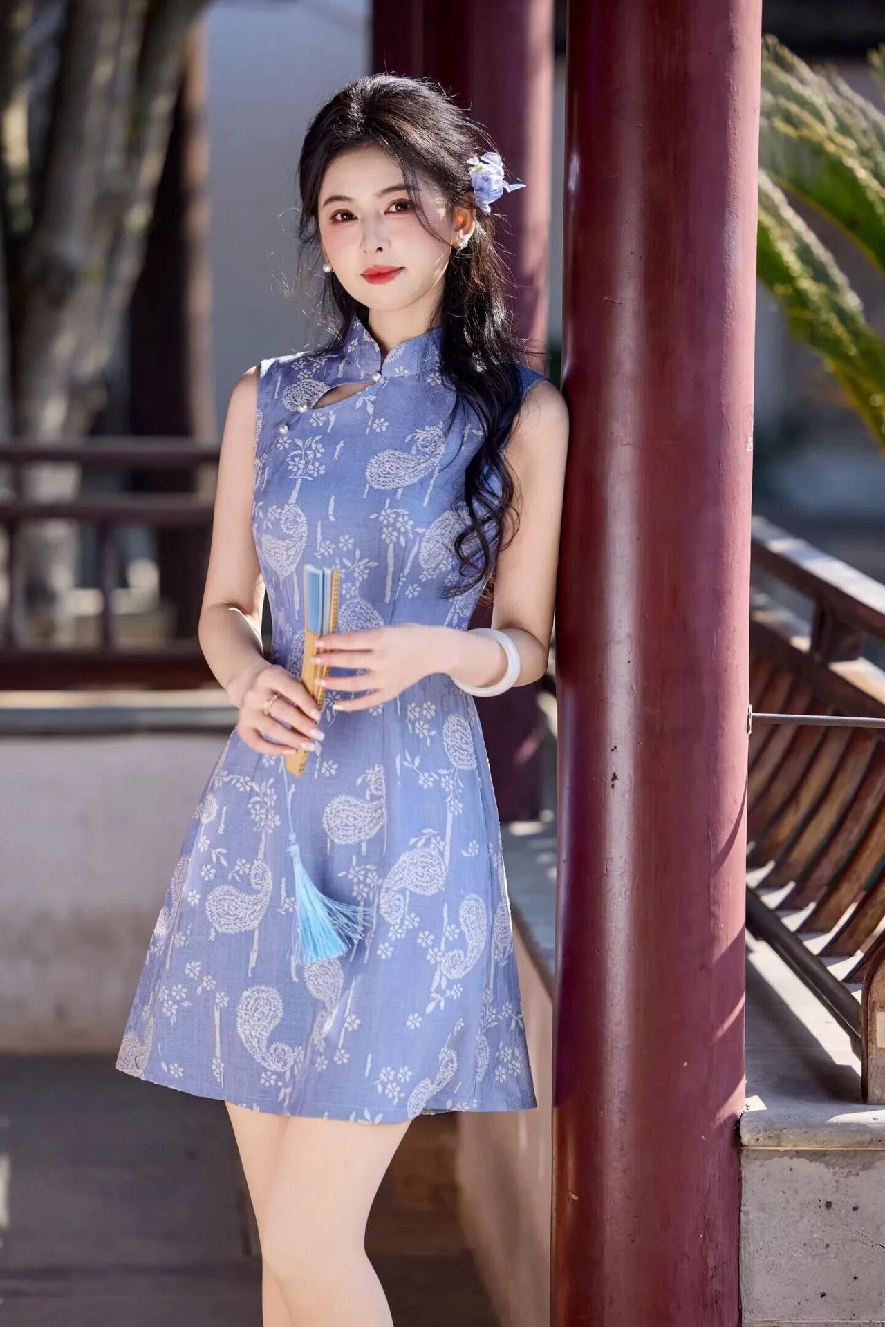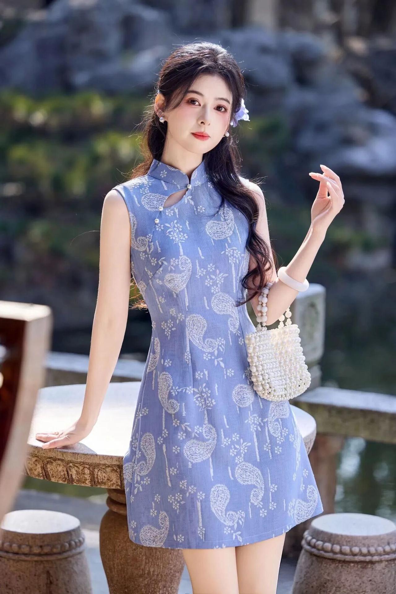 一身雾蓝无袖改良短款旗袍,清冷治愈的莫兰迪蓝底色,搭配精致白色暗纹提花,复古立领+温婉小心机镂空盘扣,完美复刻中式古韵;A字短裙版型灵动减龄,利落无袖设计清爽秀气,温柔勾勒曼妙身姿,弱化传统旗袍的成熟感,自带清甜少女氛围感。