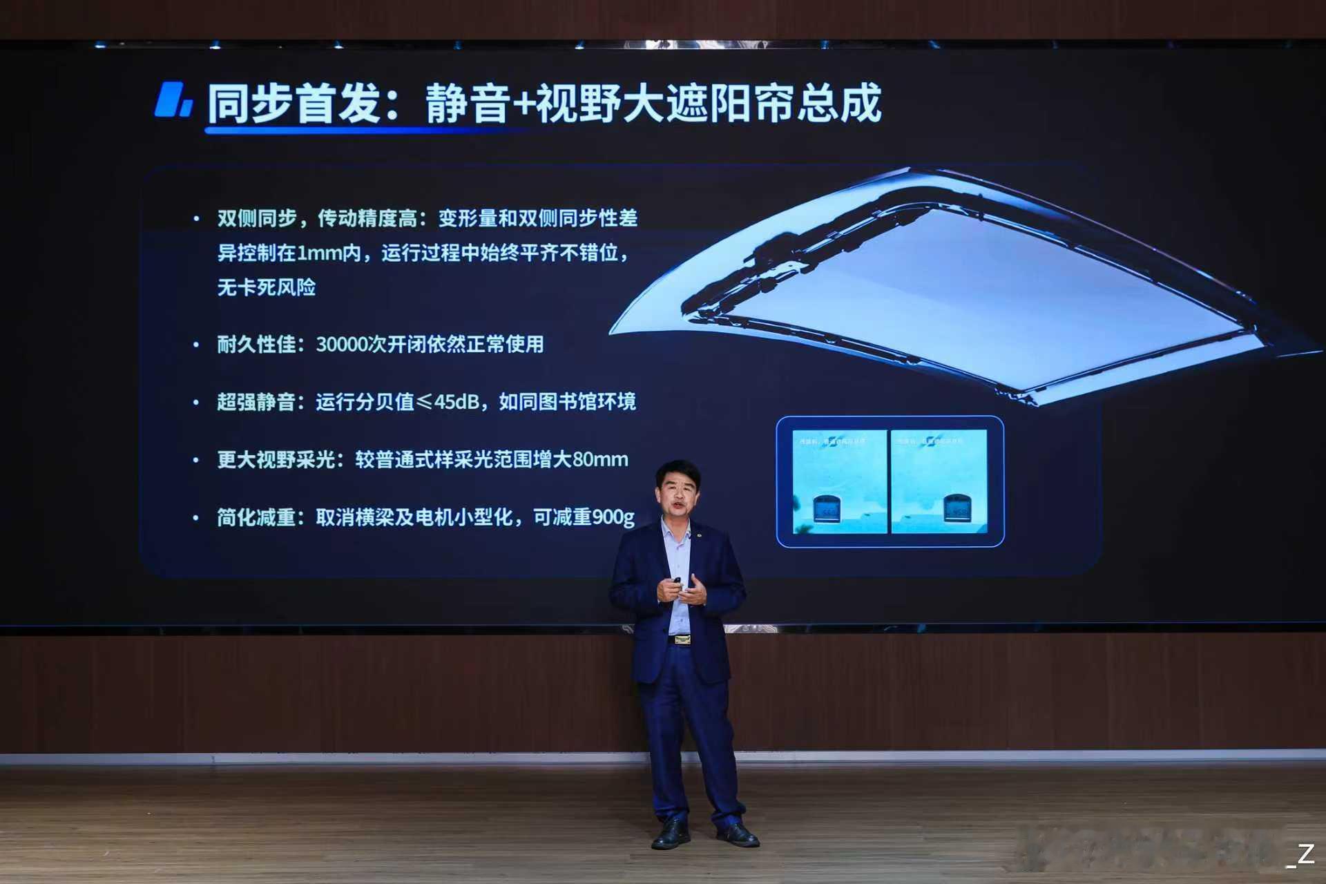 而且不仅有AI调光隐私玻璃的随心控光,更有同步首发的静音+视野大遮阳帘总成!
