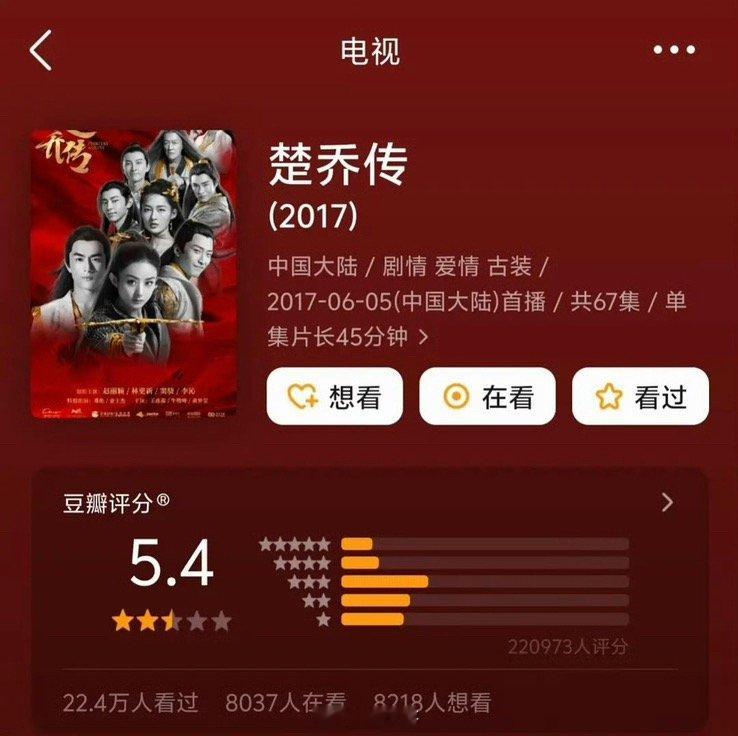 楚乔传豆瓣评分5.4 谁能想到九年前的剧,居然还能再次翻红。赵丽颖电视剧女王的含金量还在上升,《冰湖重生》开播后,因为是《楚乔传》第二部,所以赵丽颖版本的《楚乔传》又一次走到观众面前,没想到这部剧的豆瓣评分只有5.4,可惜了……赵丽颖楚乔传翻红