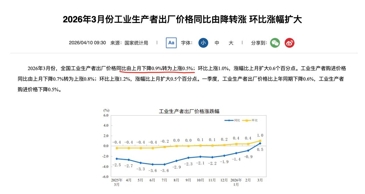 统计局发布,2026年3月份,PPI由上月下降0.9%转为上涨0.5%。