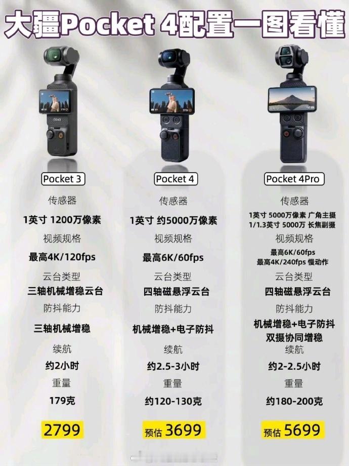 pocket4全球官宣发售价成谜 作为pocket系列的老用户,还是非常期待的。至于售价众说纷纭,而我更关注的是性能上又憋着什么新的大招。拭目以待。 大疆pocket4新品盲拍
