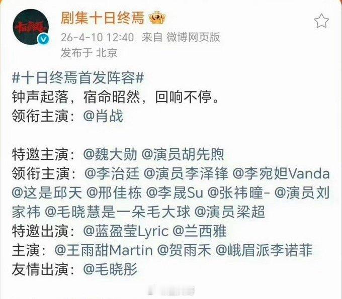 十日终焉置顶领衔主演肖战 肖战这才是顶流男艺人的待遇吧。《十日终焉》卡点齐夏生日,官宣领衔主演肖战。还把这个博文置顶。所以说文案来看:这盘棋,只能由齐夏来下,这部剧也只能肖战来演,就是说肖战能无缝进组,也是对战哥的认可啊!肖战十日终焉待遇