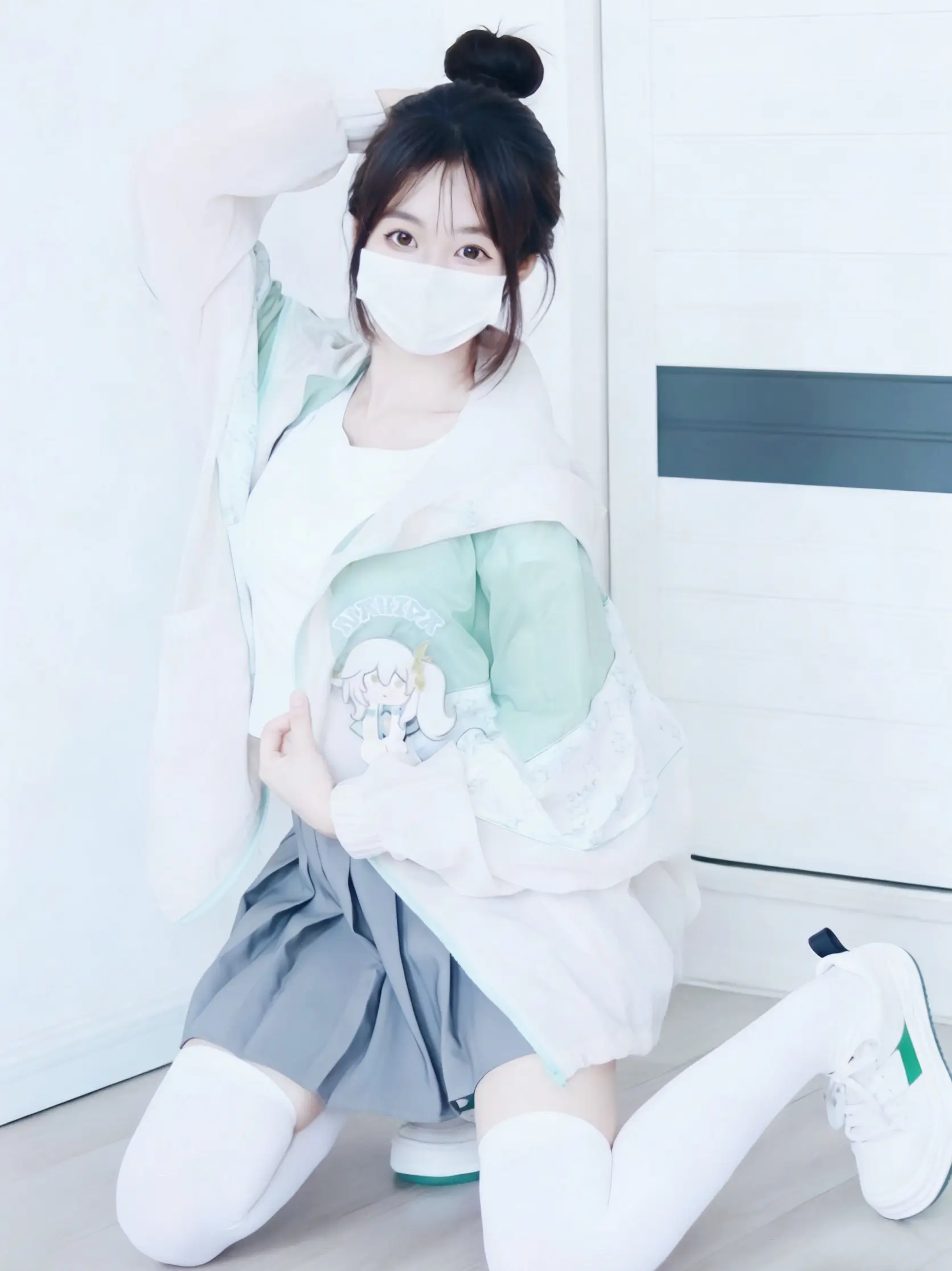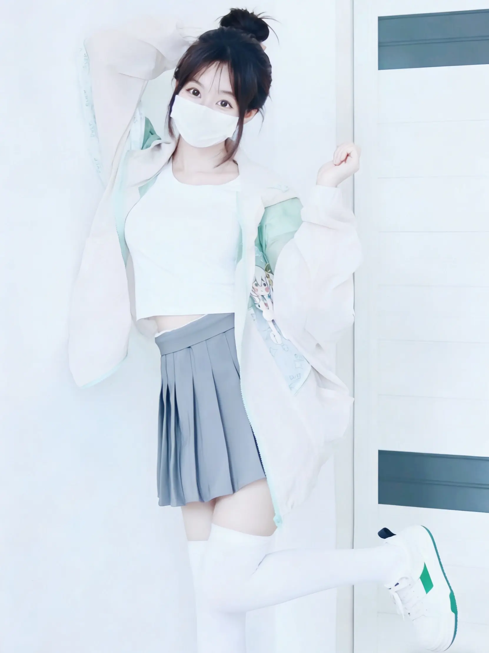 白绿拼色防晒衣+白背心+灰百褶裙,一套出门超省心