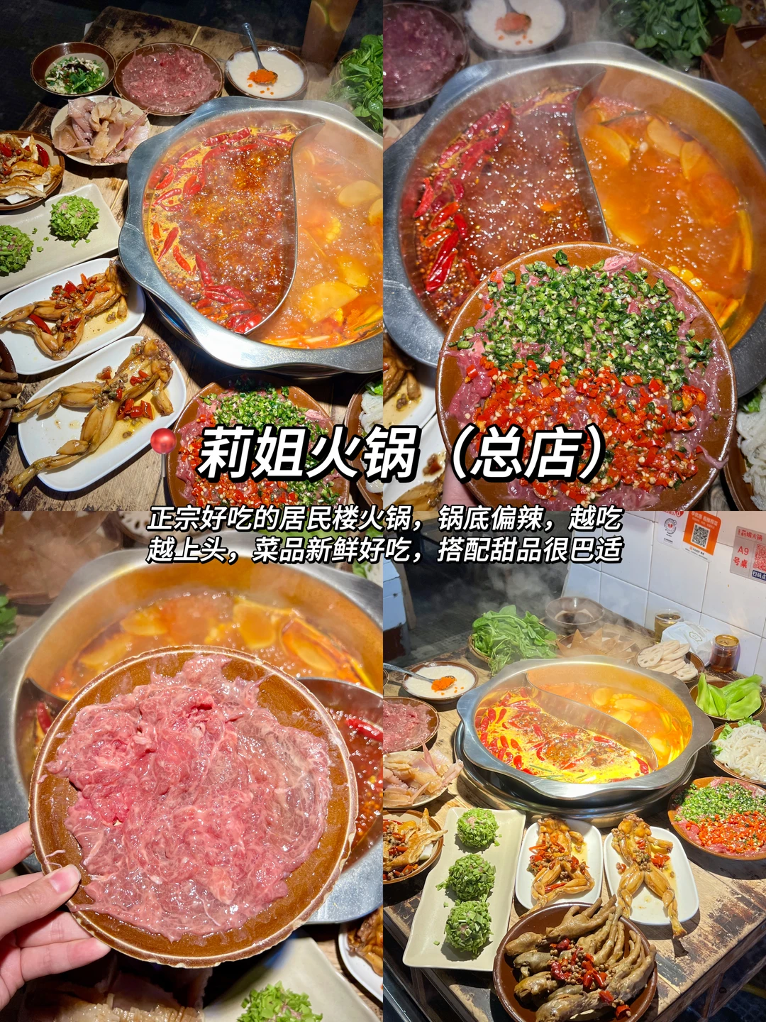 3️⃣莉姐火锅(总店):在戴家巷附近的居民楼下,离洪崖洞也很近,附近生活气息很浓厚,锅底比较辣,不能吃辣点个微微辣就行了,咸蛋黄贡菜肉丸一定要吃,超大一个,口感脆脆嫩嫩的,还有甜品饮品都不甜腻,搭配火锅很安逸
