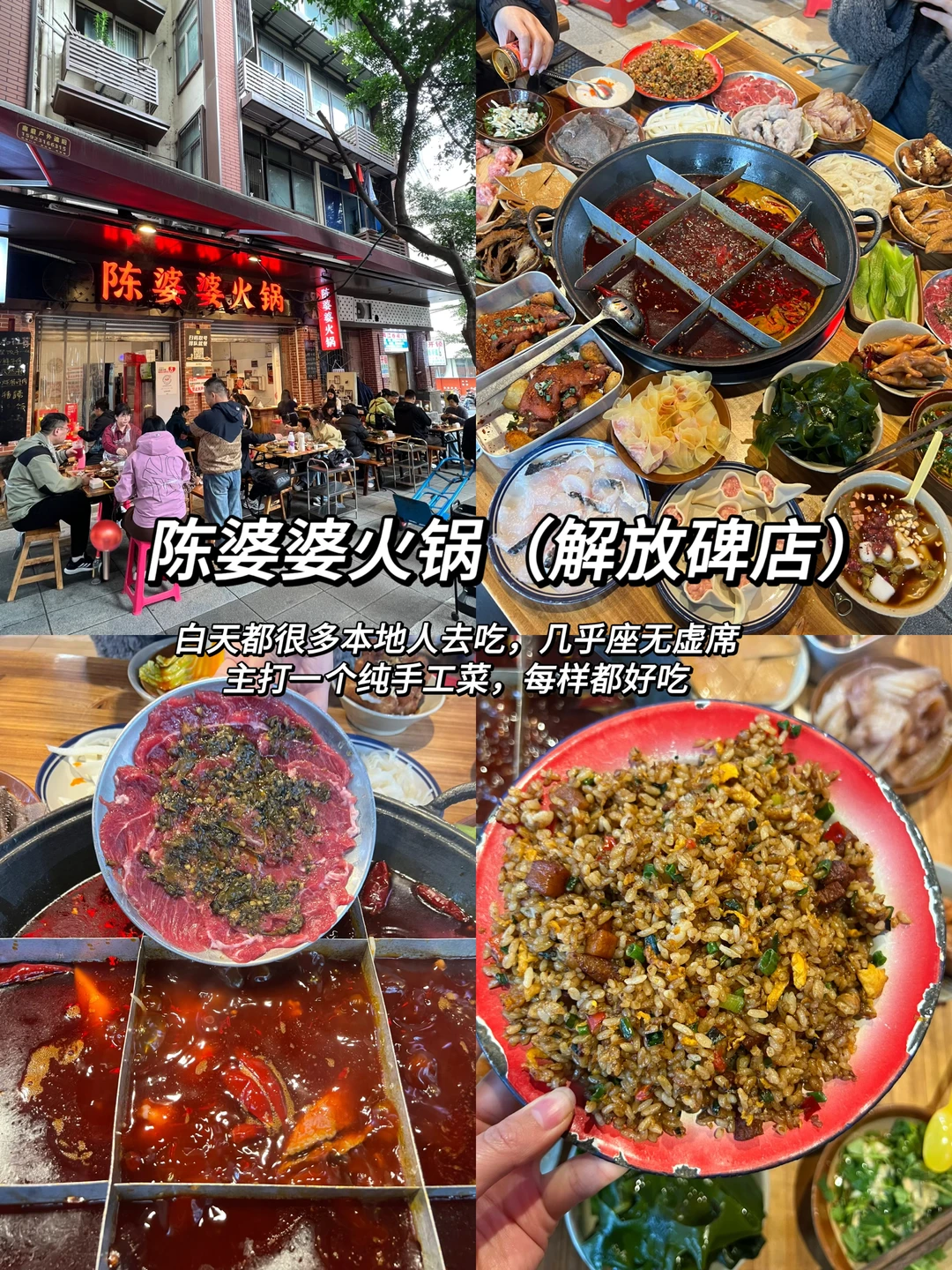 2️⃣陈婆婆火锅(解放碑店):居民楼下的社区火锅,密子君同款,主打一个纯手工制作,菜品新鲜好吃,虎皮猪蹄焦焦糯糯的特别香,他家性价比也高,素菜1r起,荤菜8r起,人均六七十吃得特别舒服