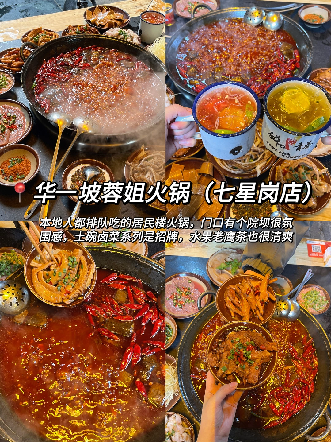1️⃣华一坡蓉姐火锅(七星岗店):华一坡居民楼下的院坝火锅,每次去都是排满队,坐在院坝吃火锅很巴适,土碗卤菜系列一定要吃,卤鸡爪、卤肥肠、卤猪蹄,每样都好入味,觉得辣可以搭配一杯水果老鹰茶解辣解腻