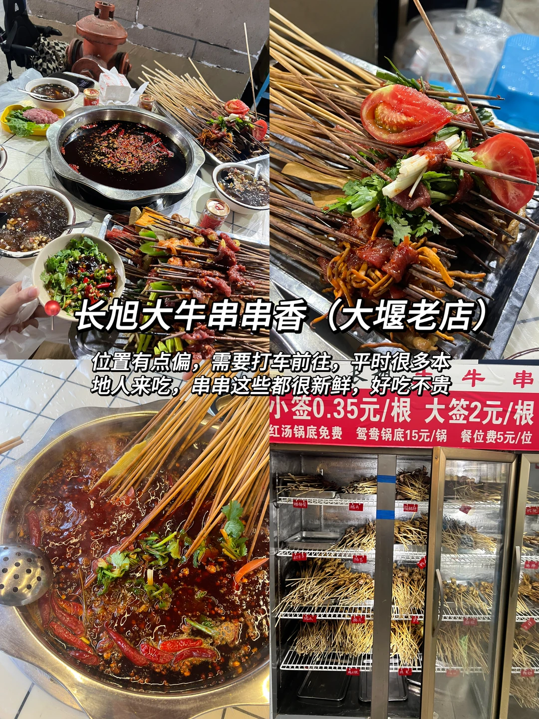 4️⃣长旭大牛串串香(大堰老店):位置有点远,离轻轨也很远,建议打车前往,环境很普通,但是有好几个门面,特别大,串串这些都是现串的很新鲜,性价比也高,人均五十