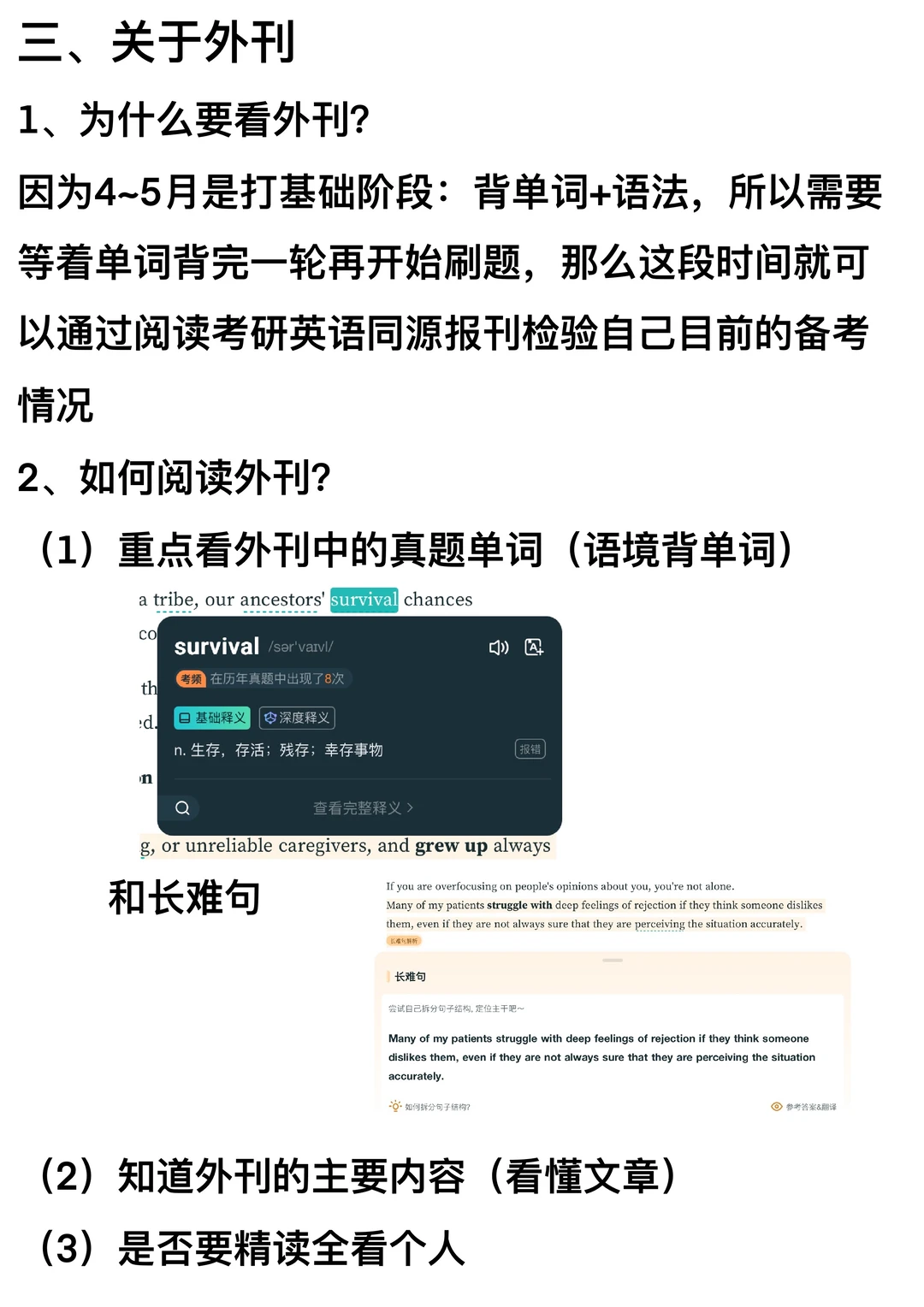 备考资料:单词书、语法笔记、长难句、外刊
