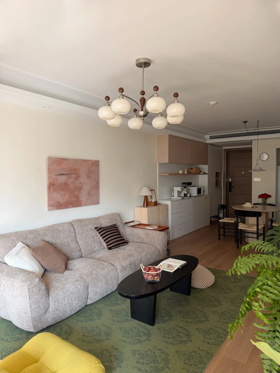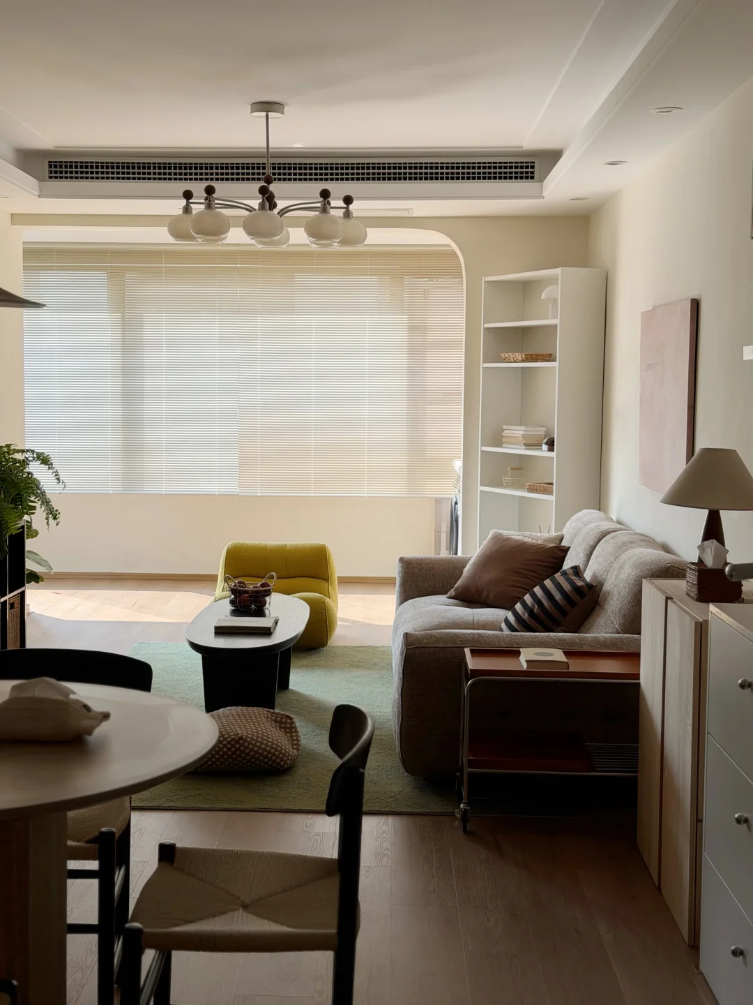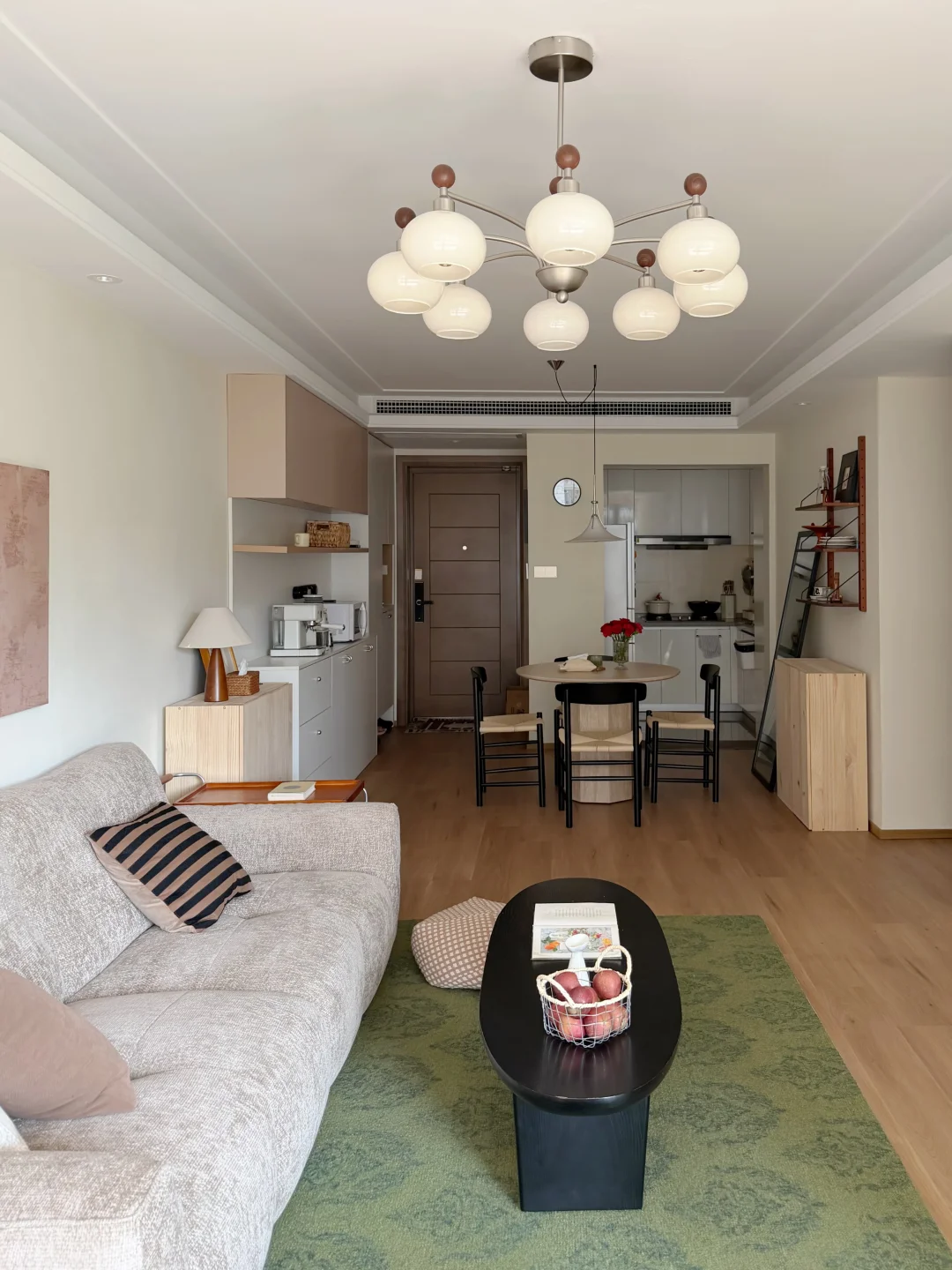 客厅在原有的灰色瓷砖上直接铺了spc地板 家具也多是选择耐看的低饱和色 8头的柿子灯装在客厅好看又好用