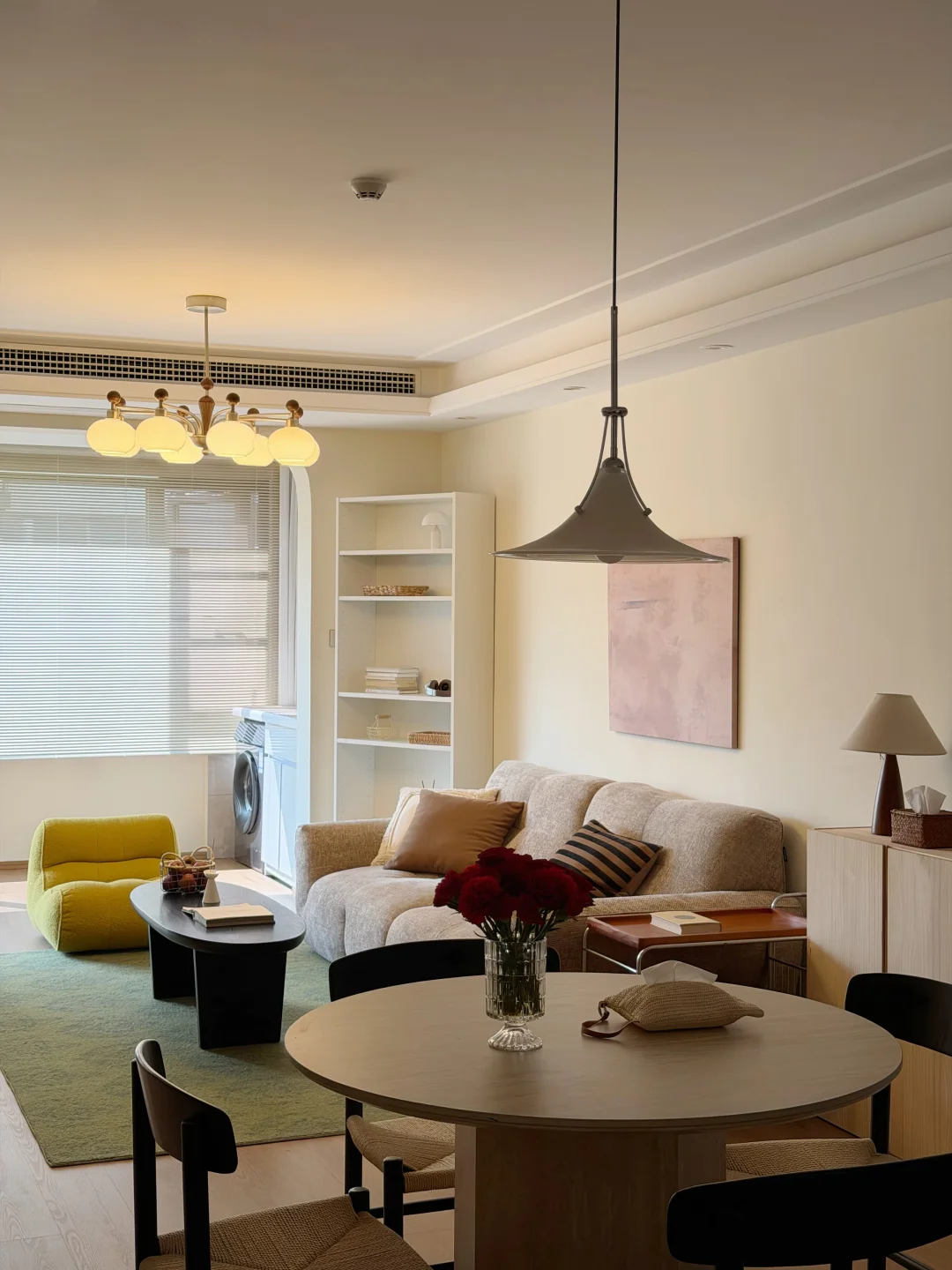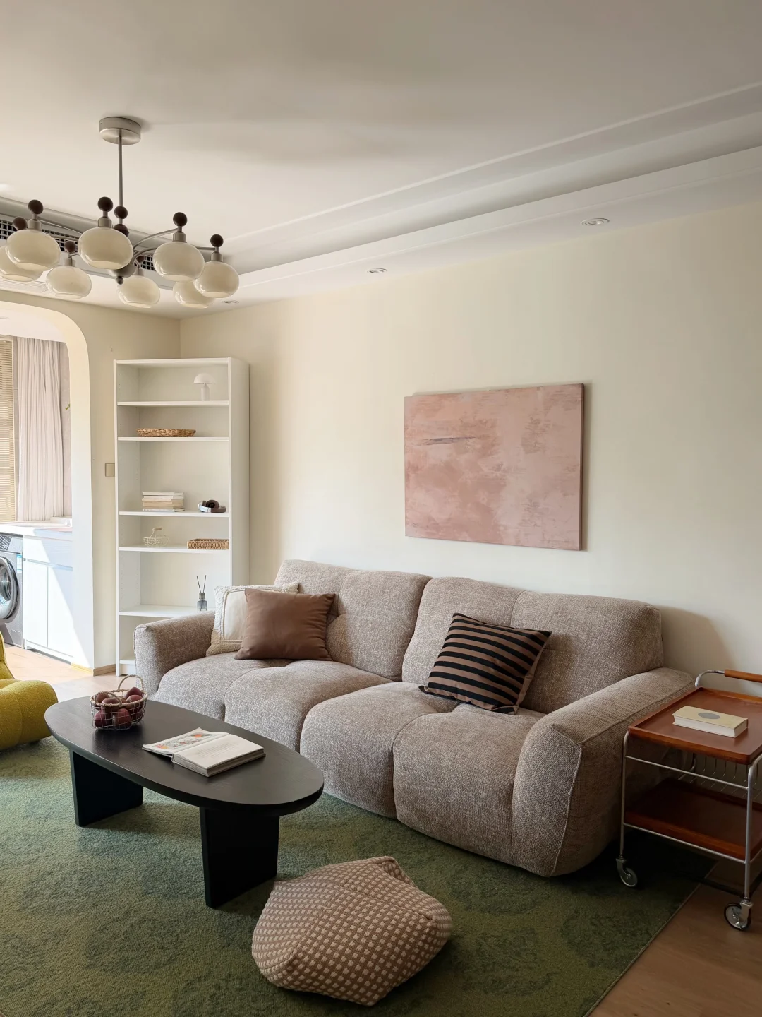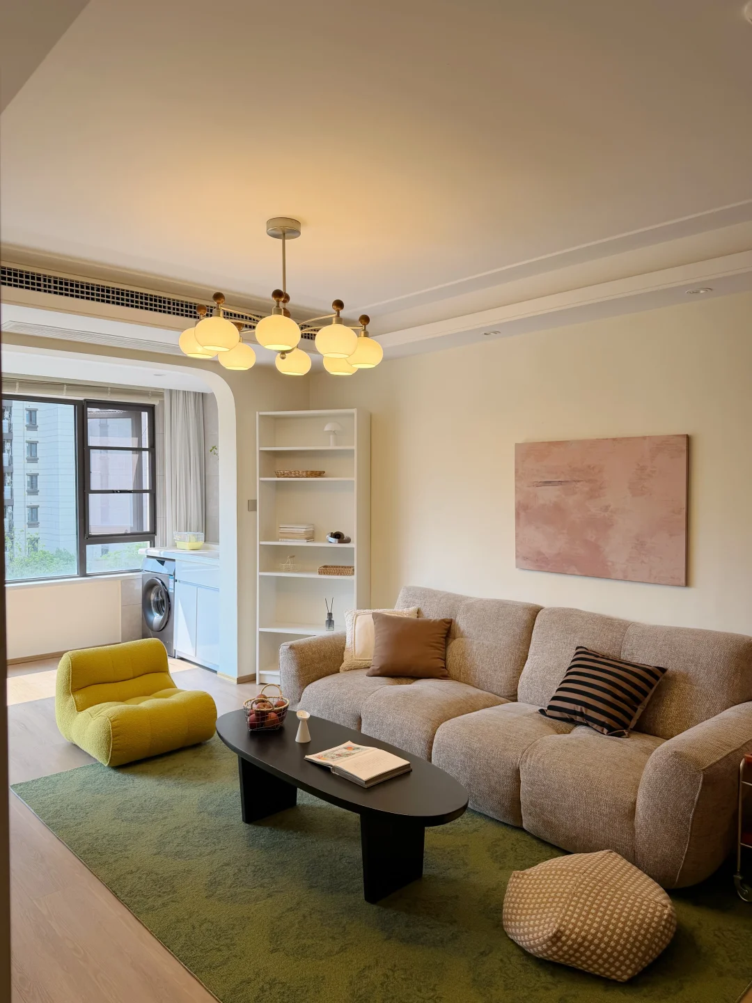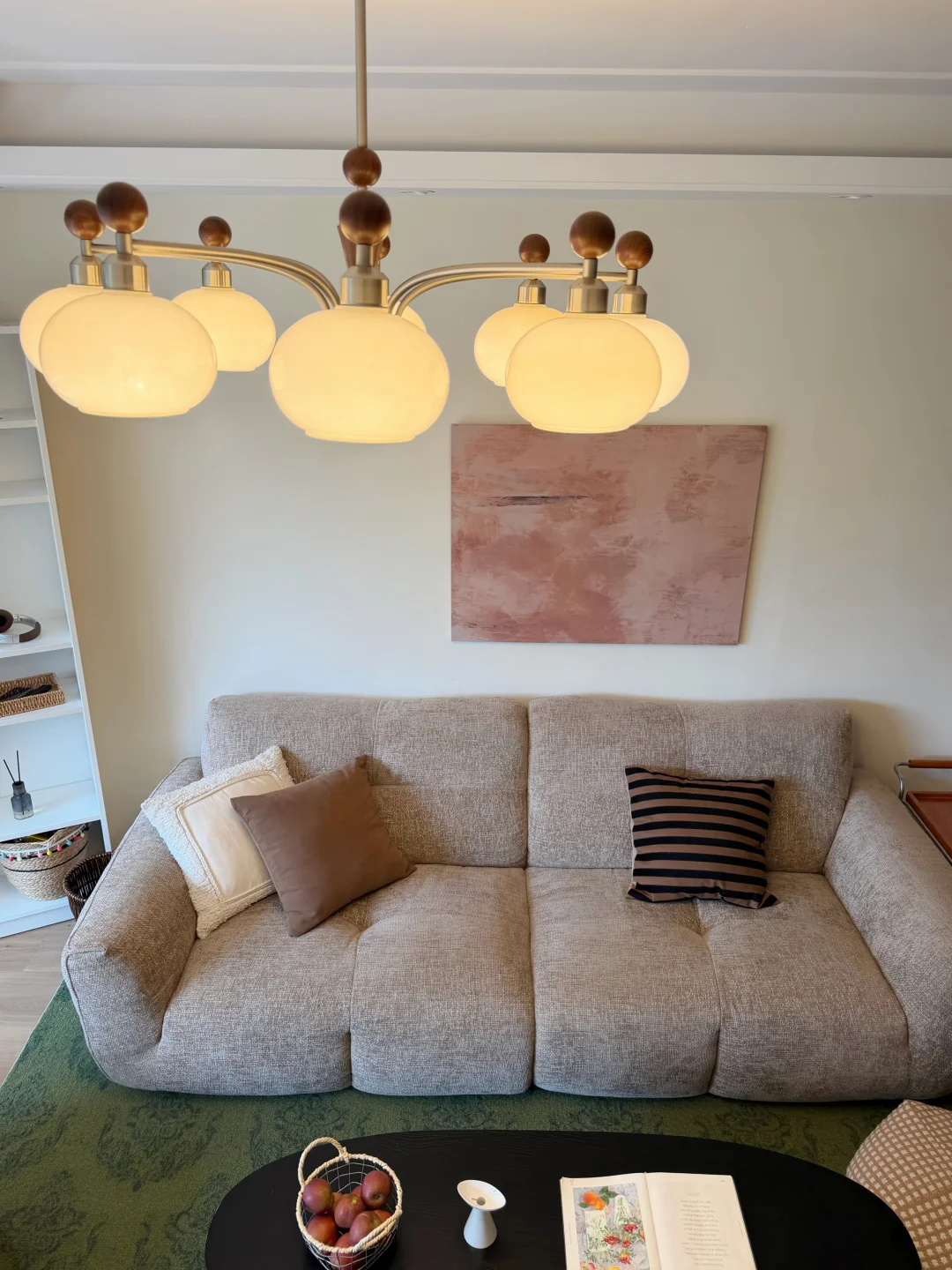 客厅在原有的灰色瓷砖上直接铺了spc地板 家具也多是选择耐看的低饱和色 8头的柿子灯装在客厅好看又好用