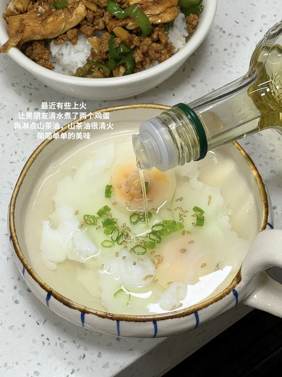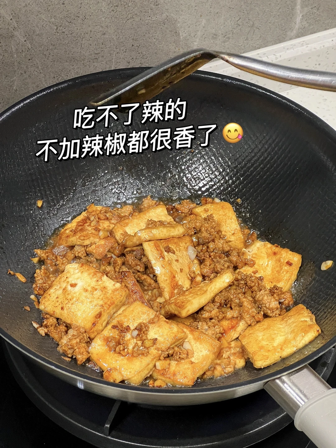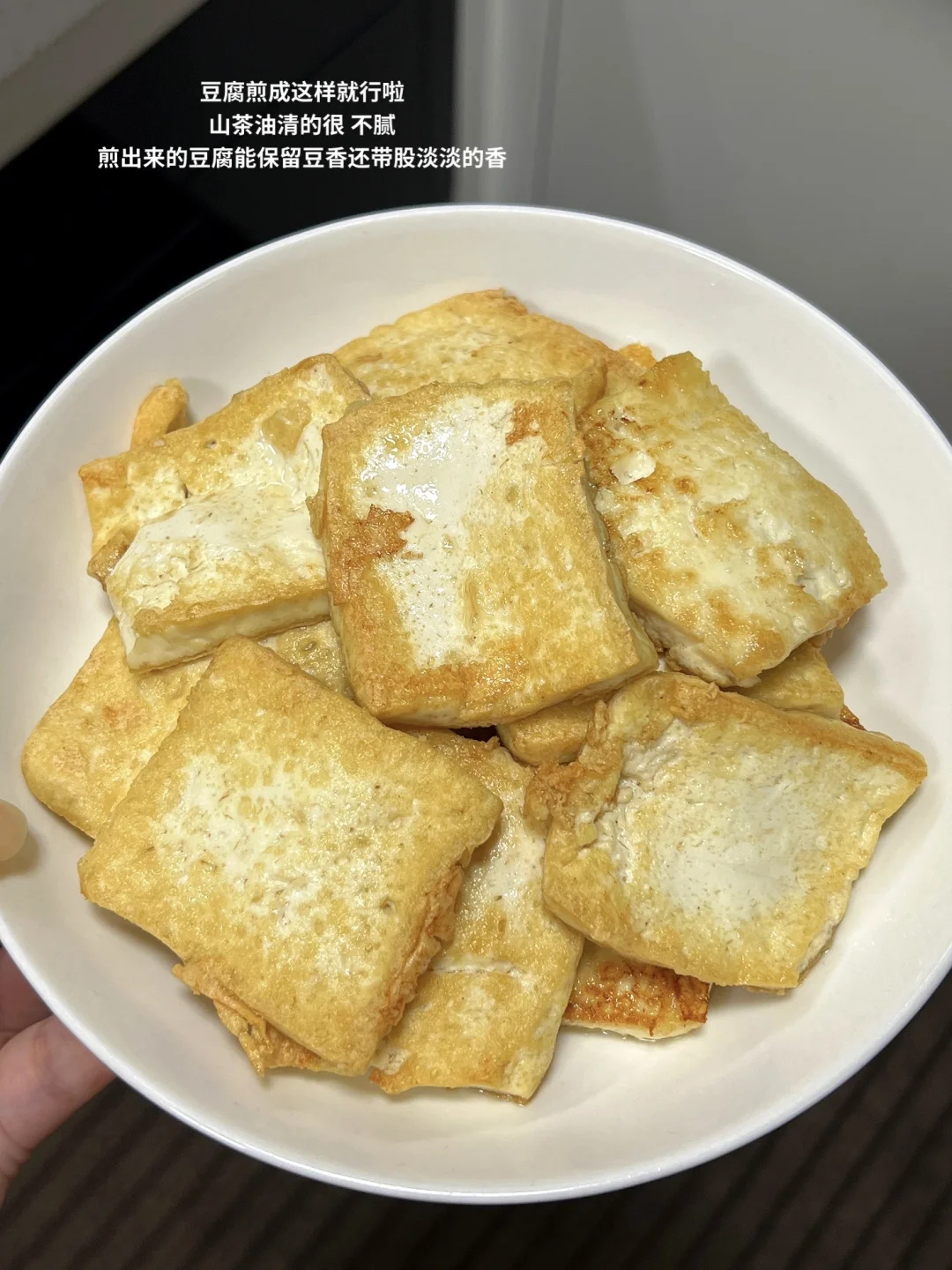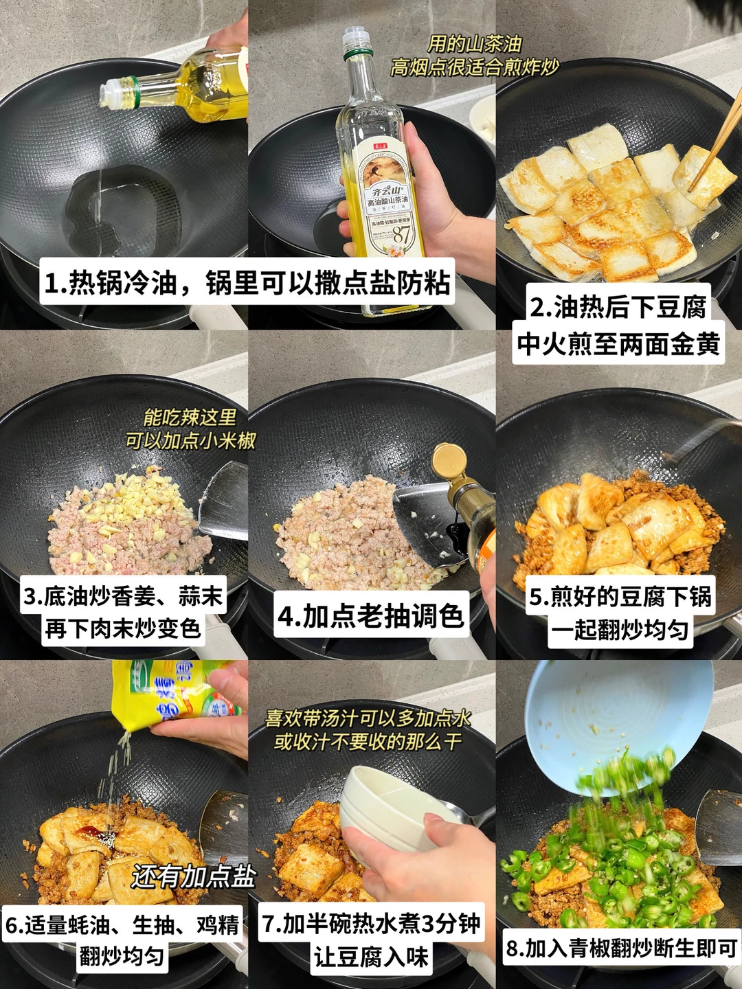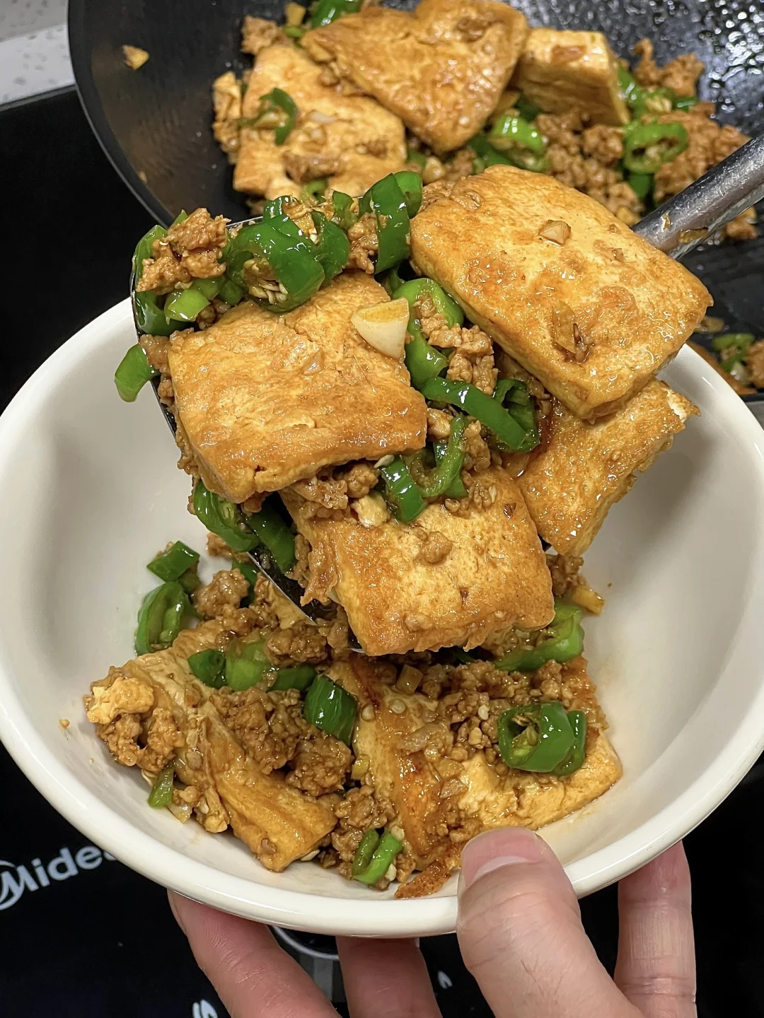 豆腐需要先煎的两面金黄,锅烧热再倒油,油用的咱们赣州齐云山(从小就吃它们家的酸枣糕)的山茶油,山茶油高烟点真的很适合我男朋友顿顿爆炒,可以轻松烧到200°C以上,豆腐下锅就能快速定型,外皮金黄酥脆,而且这油清得很不会腻,煎出来的豆腐,能完整保留豆腐的豆香还带股子淡淡的香。再加点水焖煮一会会,豆腐吸满了肉末青椒的汤汁,一咬爆汁香喷喷😋!!