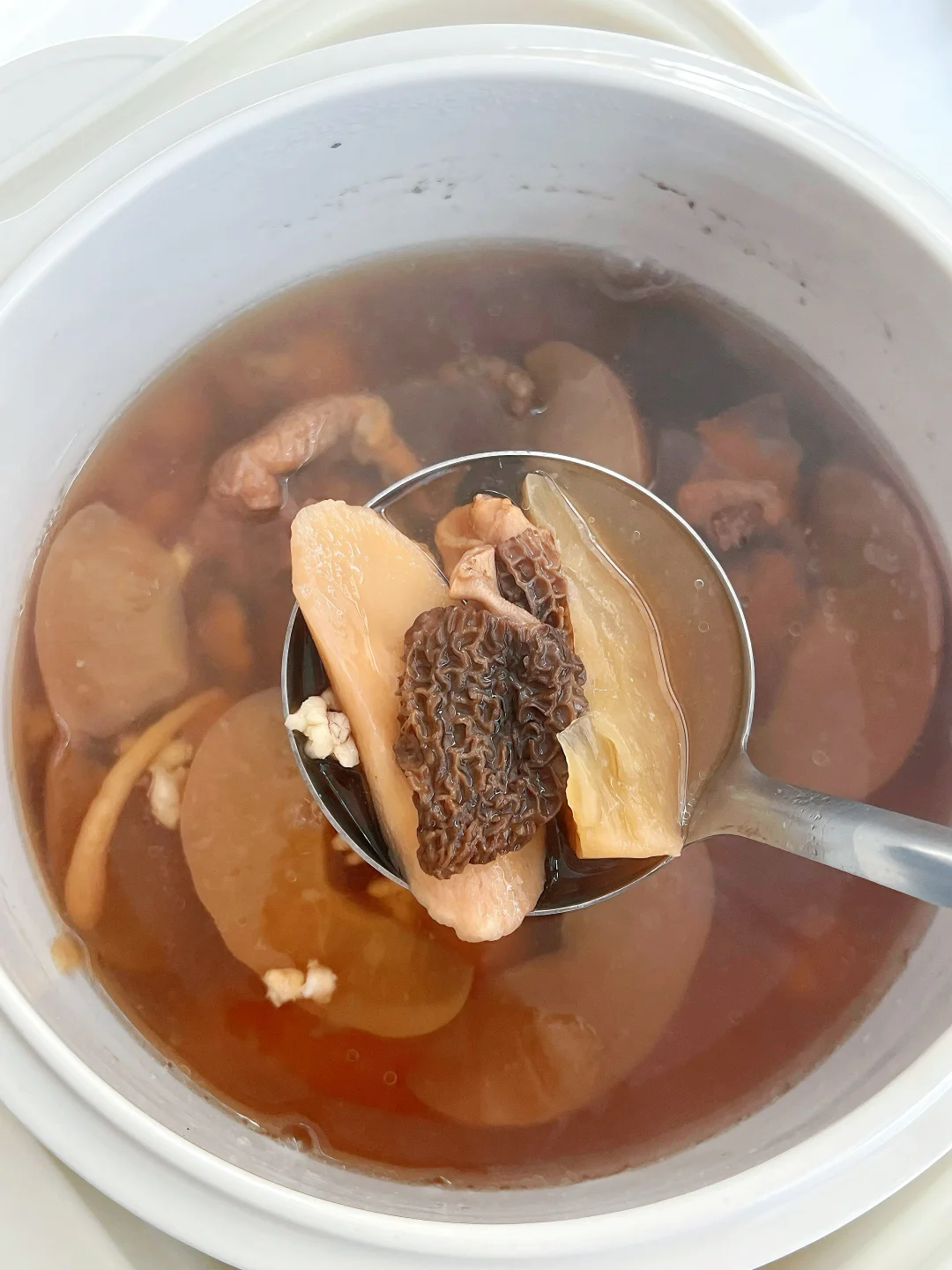 2️⃣菌菇泡发: 羊肚菌用温水泡发20-30分钟,泡发的水过滤后别倒,可以一起入锅炖煮,汤味会更鲜美。
