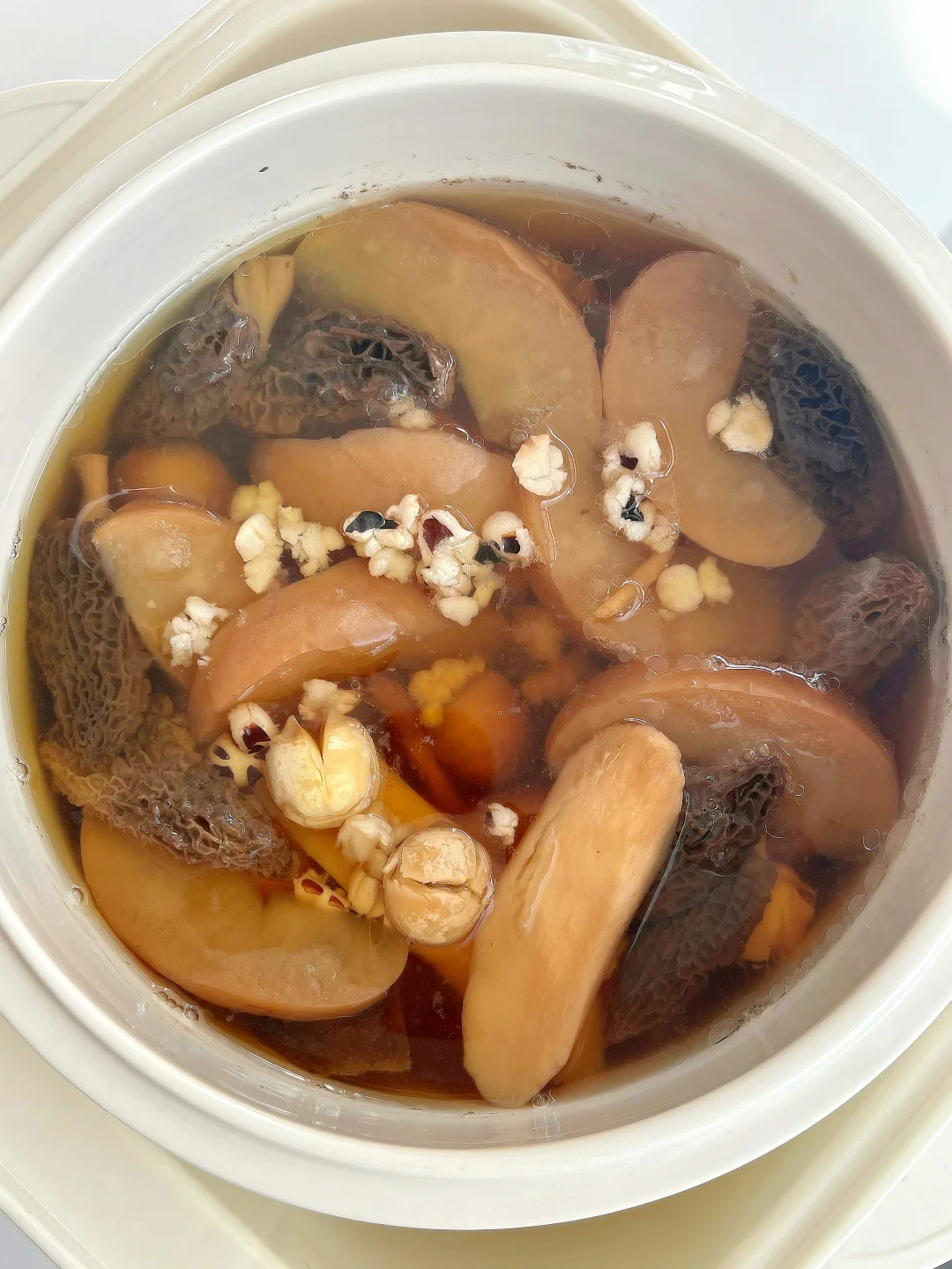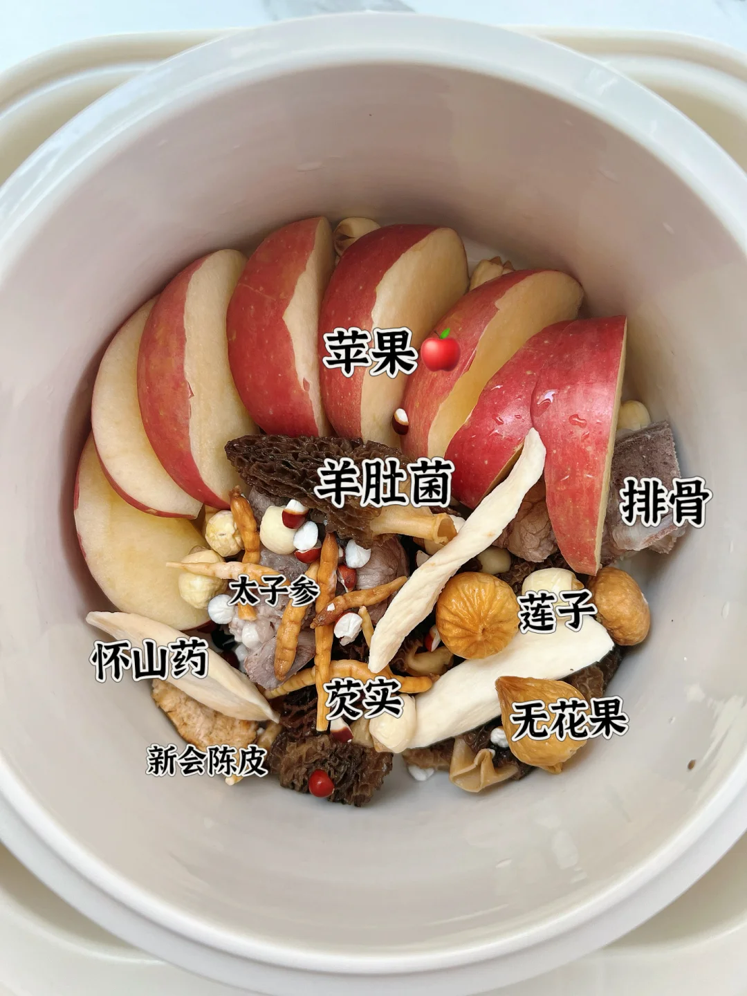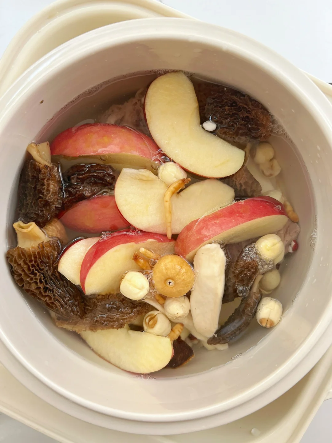 这道汤我还搭配了苹果+羊肚菌!能健脾生津助消化、清热祛湿,温和调理脾胃,提高免yi力,汤水鲜甜不油腻,整体口味酸酸甜甜很开胃[赞R]不寒不燥,孩子爱喝~