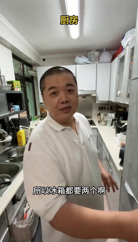 林子聪先是从厨房开始展示,一眼望过去,厨房摆放的较为杂乱,林子聪解释家里人多,所以厨具也比较多,连冰箱都准备了两个。