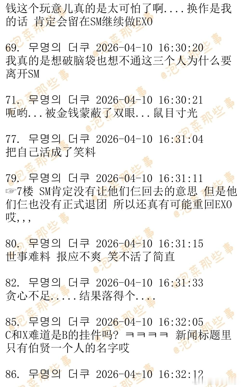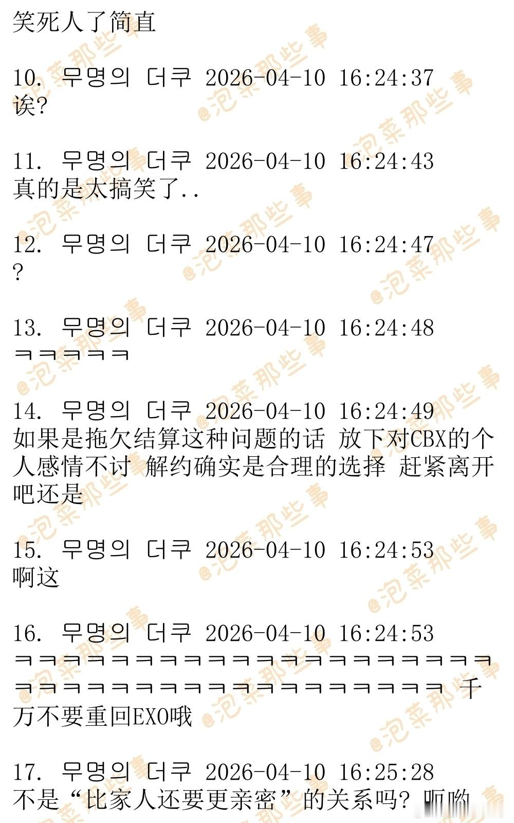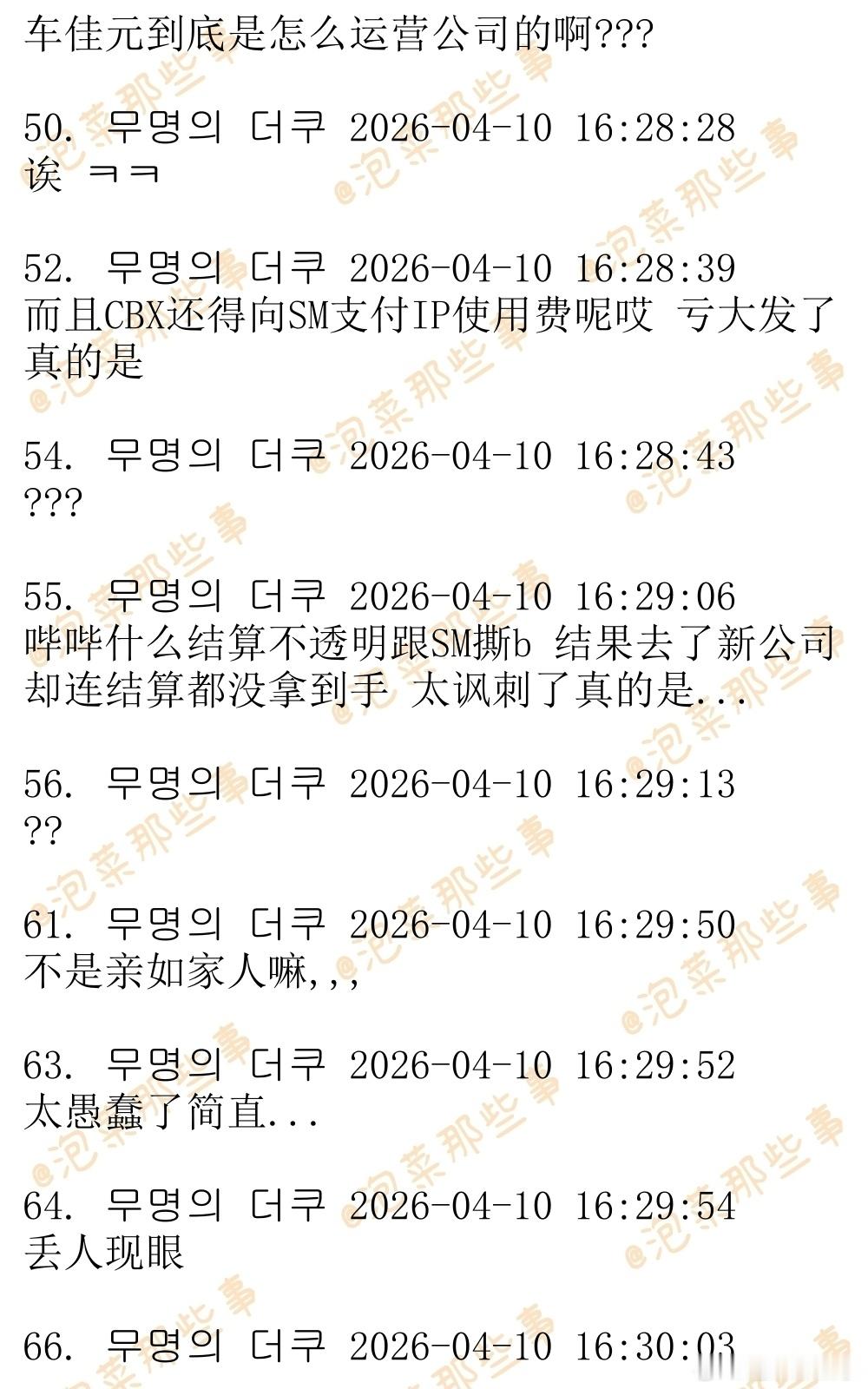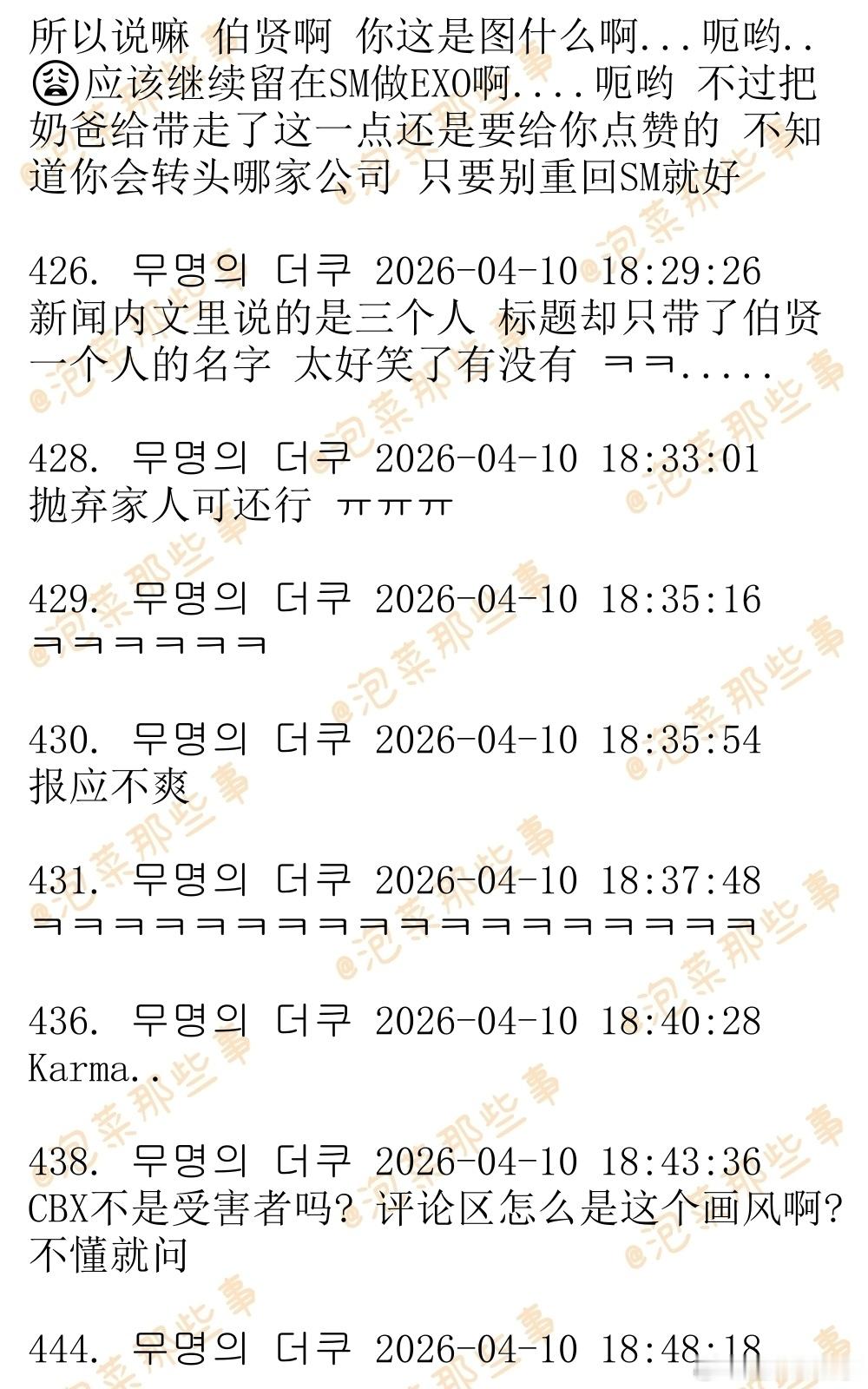 🔥🔥韩网500楼热帖评论翻译🔥🔥边伯贤离开INB100边伯贤金珉锡金钟大解约 据韩媒报道,CBX(CHEN,伯贤,秀珉)也离开了车佳元的怀抱。据悉,CBX已于3月末要求INB100代表车佳元就未按期结算等违约行为给出答复,并发送了解约通报内容证明。但是两周时间过去,CBX并没有得到有说服力的答复。INB100为伯贤从SM娱乐独立后创立,并于2024年5月被车佳元与MC梦共同创立的ONE HUNDRED收购,成为其子公司。车代表利用CBX的名头签署了巨额合约,收取了数百亿预付款,但却让公司深陷财务危机。CBX三个人被拖欠了高达数十亿的结算。在此之前,ONE HUNDRED旗下THE BOYZ,李泰民,李茂珍,VIVIZ,李昇基等都已经陆续宣布解约离开了公司,车代表现在已经成了光杆司令。cr.theqoo