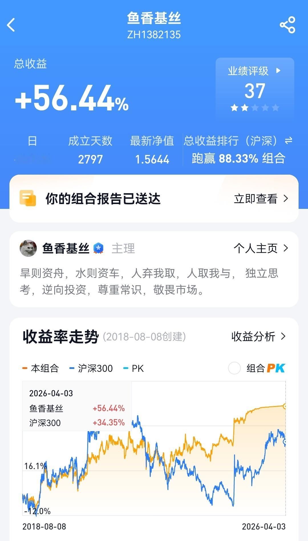 2026年4月3日鱼香基丝指数基金投资组合实盘周报 成立以来场外组合收益率18.1%,场内组合56.4%,跑赢同期沪深300指数29个百分点。本周继续加仓极低估蓝筹指数,组合总仓位20%,仓位具体占比为:港股通互联网指7%,港股通消费指数4%,中证消费指数4%,中证医疗指数4%、300非银指数1%。本周大盘继续下跌,组合跑赢大盘的百分比继续增加一个百分点。组合加入一个新的指数300非银指数,成分股主要为证券公司和少数保险公司,经过前期暴跌,现在估值极低,pe百分位到达历史极低位置,所以逢跌买入了一点。最近泡泡玛特股价暴跌,是港股通消费指数的重仓股,所以我们也乘机加仓,清明节去各大商场看,泡泡玛特门店的巨大客流量明细高于旁边商家,还是一个好生意,正好以便宜的价格买入优秀的企业。最近股市大跌,很多追涨的人都被套了,开始赖某某队大资金割韭菜,每次听到这种说法都觉得很可笑,你都知道割韭菜了,为啥你还要去当韮菜呢?还不是因为你贪婪呗,看见人家赚钱你也想赚钱,4000点以上的高位横盘这么长时间你还不跑,反倒加仓,不收割收割谁呢?投资赚钱了赖自己,赔钱了赖市场,赖某某队,赖量化,赖打仗,就是不赖自己投资水平差,这不就是标准的巨婴思维吗?我们决不当巨婴,尊重常识,敬畏市场。现在沪深300指数估值依旧偏高,未来下跌是大概率事件,现在只能买一点点极低估的指数。看到巴菲特的伯克希尔持有现金创历史新高现金仓位高达44%的新闻,股神也觉得现在市场高估了,面对高估的市场,我们要做的很简单,耐心等待,现金为王。股票a股投资
