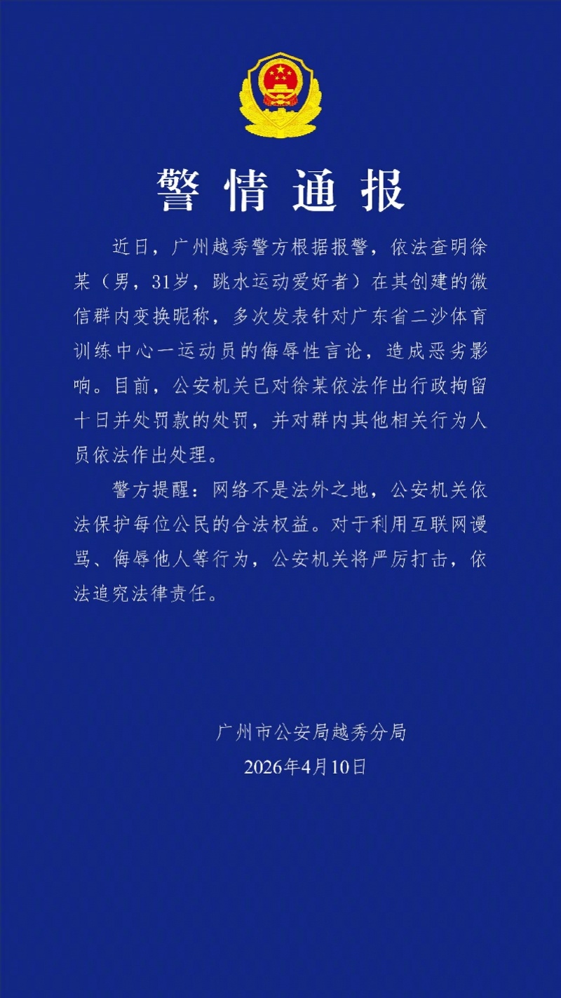【公安部公布全红婵遭网暴案详情!男子建群换昵称恶意拉踩引战】4月10日,南都N视频记者注意到,在广州越秀警方通报全红婵遭网暴案后,公安部网安局公众号再次针对此事发文,称公安机关网安部门将依法严厉打击以“饭圈”形式对运动员、教练员及管理人员进行网上侮辱、诋毁、诽谤等违法犯罪活动。