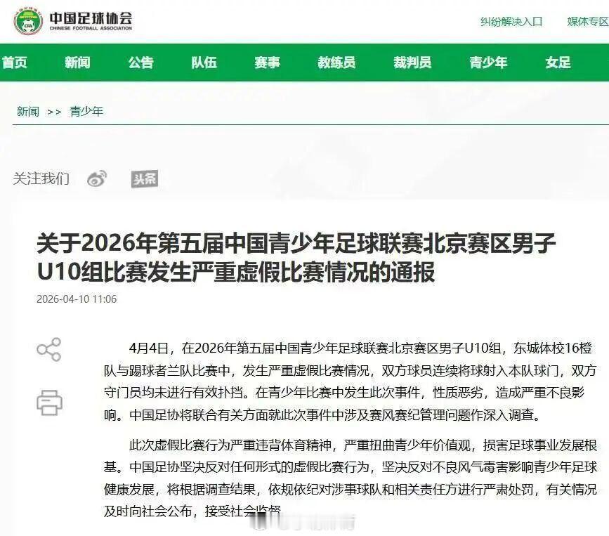 足协将深入调查中青赛u10组假赛足球 又是北京足协,触目惊心,这是在荼毒中国足球